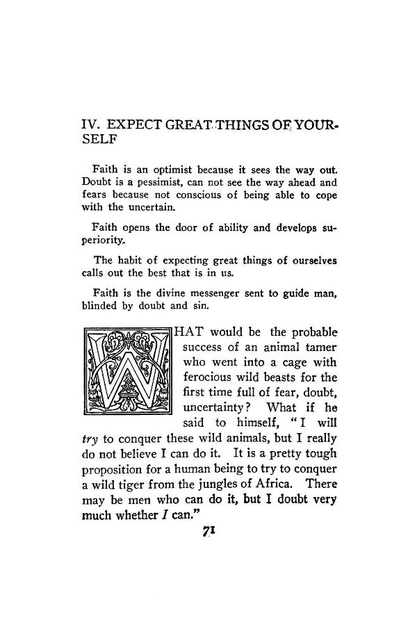 WHAT would be the probable success of an animal tamer who went into a cage with ferocious wild beasts for the first time full of fear, doubt, uncertainty? What if he said to himself, "I will try to conquer these wild animals, but I really do not believe I can do it. It is a pretty tough proposition for a human being to try to conquer a wild tiger from the jungles of Africa. There may be men who can do it, but I doubt very much whether I can."