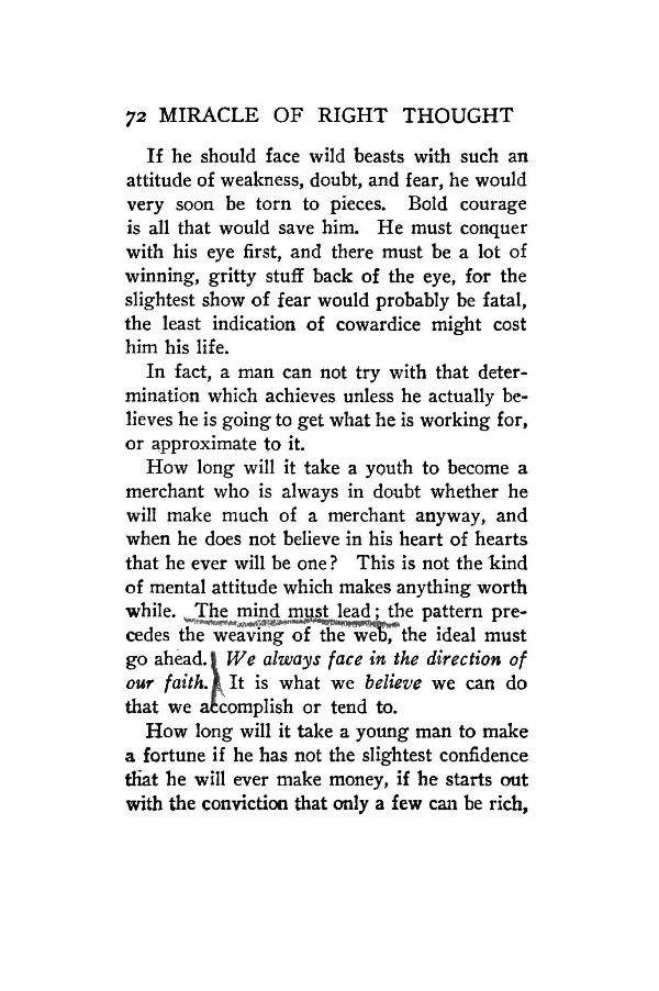 The mind must lead; the pattern precedes the weaving of the web, the ideal must go ahead. We always face in the direction of our faith. It is what we believe we can do that we accomplish or tend to.