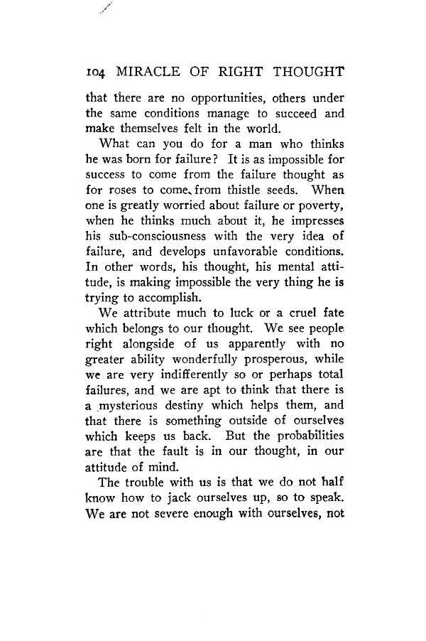 We attribute much to luck or a cruel fate which belongs to our thought. We see people right alongside of us apparently with no greater ability wonderfully prosperous, while we are very indifferently so or perhaps total failures, and we are apt to think that there is a mysterious destiny which helps them, and that there is something outside of ourselves which keeps us back. But the probabilities are that the fault is in our thought, in our attitude of mind.