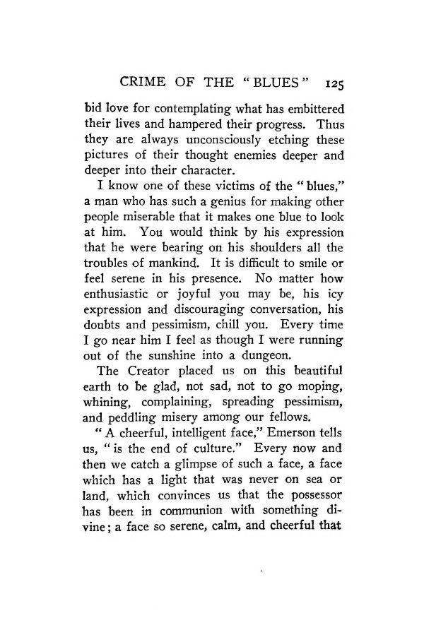 I know one of these victims of the "blues," a man who has such a genius for making other people miserable that it makes one blue to look at him. You would think by his expression that he were bearing on his shoulders all the troubles of mankind. It is difficult to smile or feel serene in his presence. No matter how enthusiastic or joyful you may be, his icy expression and discouraging conversation, his doubts and pessimism, chill you. Every time I go near him I feel as though I were running out of the sunshine into a dungeon.