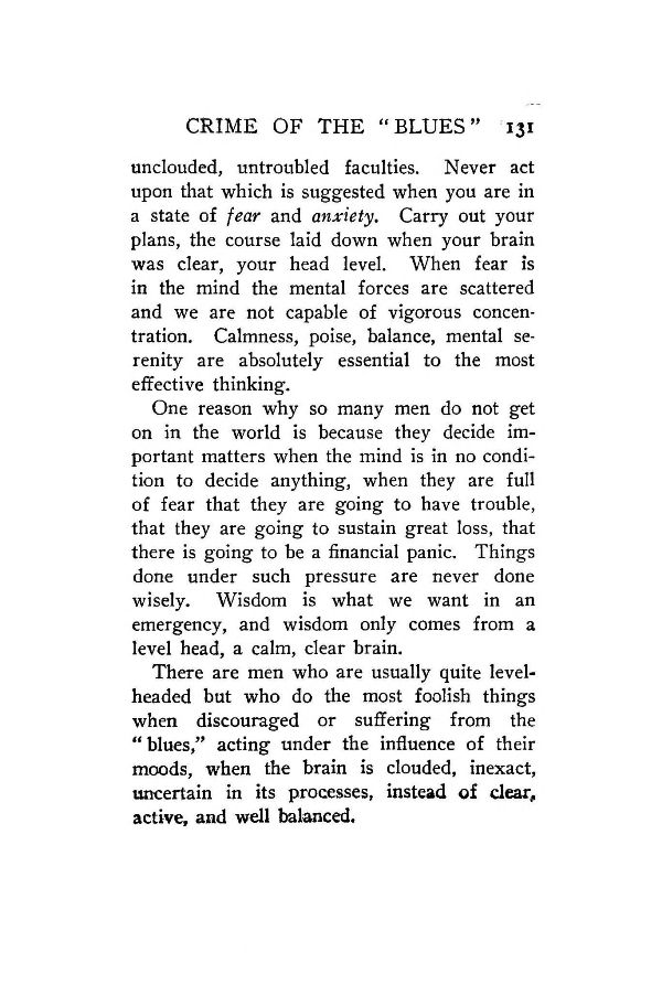 One reason why so many men do not get on in the world is because they decide important matters when the mind is in no condition to decide anything, when they are full of fear that they are going to have trouble, that they are going to sustain great loss, that there is going to be a financial panic. Things done under such pressure are never done wisely. Wisdom is what we want in an emergency, and wisdom only comes from a level head, a calm, clear brain.
