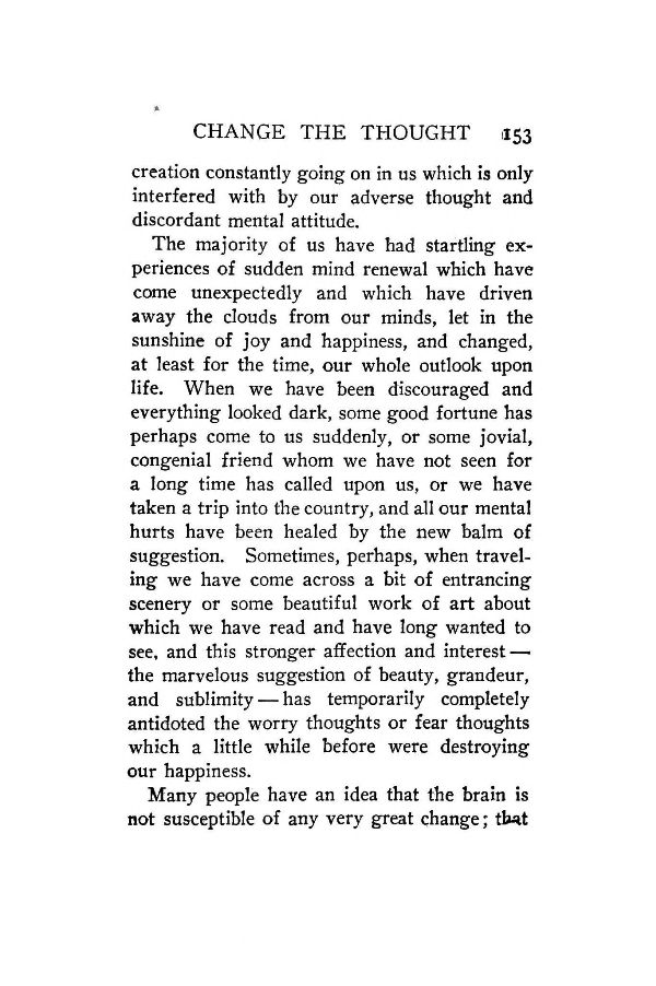 The majority of us have had startling experiences of sudden mind renewal which have come unexpectedly and which have driven away the clouds from our minds, let in the sunshine of joy and happiness, and changed, at least for the time, our whole outlook upon life. When we have been discouraged and everything looked dark, some good fortune has perhaps come to us suddenly, or some jovial, congenial friend whom we have not seen for a long time has called upon us, or we have taken a trip into the country, and all our mental hurts have been healed by the new balm of suggestion. Sometimes, perhaps, when traveling we have come across a bit of entrancing scenery or some beautiful work of art about which we have read and have long wanted to see, and this stronger affection and interest — the marvelous suggestion of beauty, grandeur, and sublimity — has temporarily completely antidoted the worry thoughts or fear thoughts which a little while before were destroying our happiness.