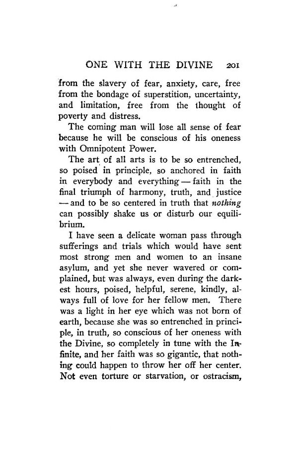 I have seen a delicate woman pass through sufferings and trials which would have sent most strong men and women to an insane asylum, and yet she never wavered or complained, but was always, even during the darkest hours, poised, helpful, serene, kindly, always full of love for her fellow men. There was a light in her eye which was not born of earth, because she was so entrenched in principle, in truth, so conscious of her oneness with the Divine, so completely in tune with the Infinite, and her faith was so gigantic, that nothing could happen to throw her off her center. Not even torture or starvation, or ostracism,
