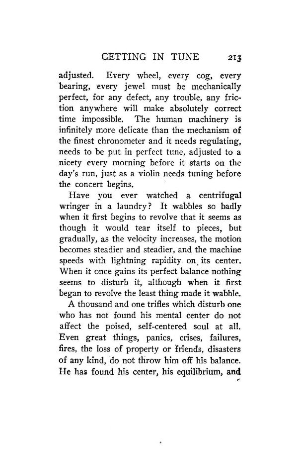 A thousand and one trifles which disturb one who has not found his mental center do not affect the poised, self-centered soul at all. Even great things, panics, crises, failures, fires, the loss of property or friends, disasters of any kind, do not throw him off his balance. He has found his center, his equilibrium, and