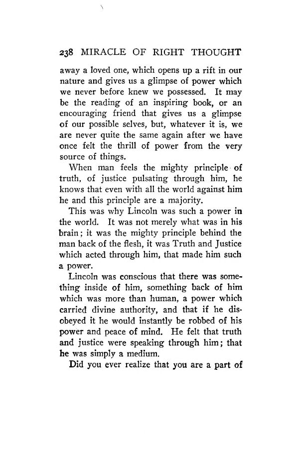 This was why Lincoln was such a power in the world. It was not merely what was in his brain; it was the mighty principle behind the man back of the flesh, it was Truth and Justice which acted through him, that made him such a power.
