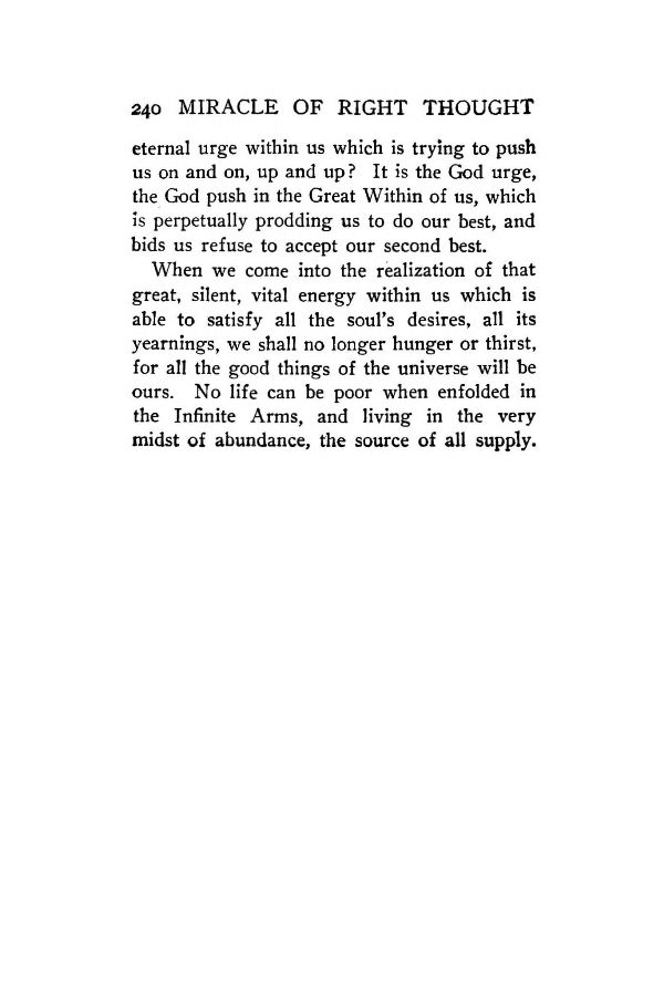 eternal urge within us which is trying to push us on and on, up and up? It is the God urge, the God push in the Great Within of us, which is perpetually prodding us to do our best, and bids us refuse to accept our second best.