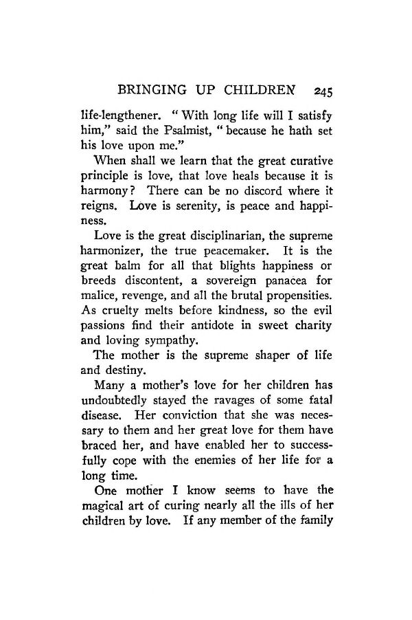 Love is the great disciplinarian, the supreme harmonizer, the true peacemaker. It is the great balm for all that blights happiness or breeds discontent, a sovereign panacea for malice, revenge, and all the brutal propensities. As cruelty melts before kindness, so the evil passions find their antidote in sweet charity and loving sympathy.