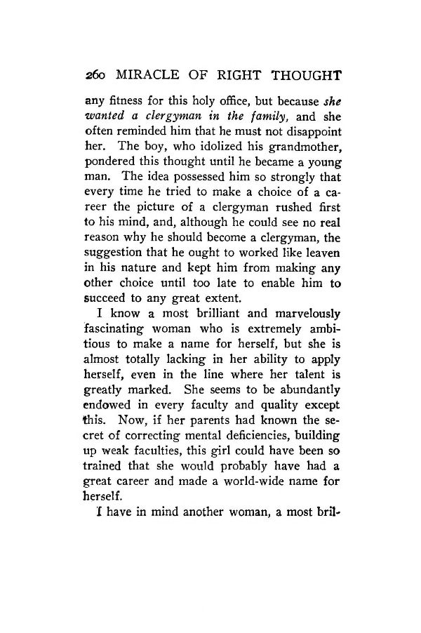 I know a most brilliant and marvelously fascinating woman who is extremely ambitious to make a name for herself, but she is almost totally lacking in her ability to apply herself, even in the line where her talent is greatly marked. She seems to be abundantly endowed in every faculty and quality except this. Now, if her parents had known the secret of correcting mental deficiencies, building up weak faculties, this girl could have been so trained that she would probably have had a great career and made a world-wide name for herself.