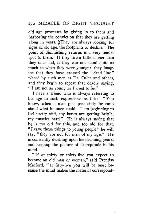I have a friend who is always referring to his age in such expressions as this: "You know, when a man gets past sixty he can't stand what he once could. I am beginning to feel pretty stiff, my bones are getting brittle, my muscles hard." He is always saying that he is too old for this, and too old for that. "Leave those things to young people," he will say, "they are not for men of my age." He is constantly dwelling upon his declining years, and keeping the picture of decrepitude in his mind.
