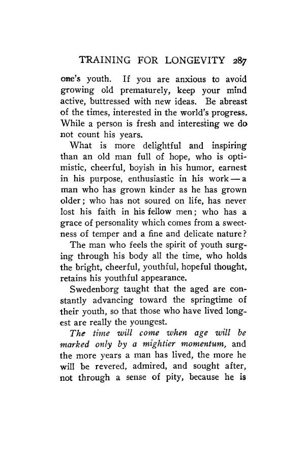 Swedenborg taught that the aged are constantly advancing toward the springtime of their youth, so that those who have lived longest are really the youngest.