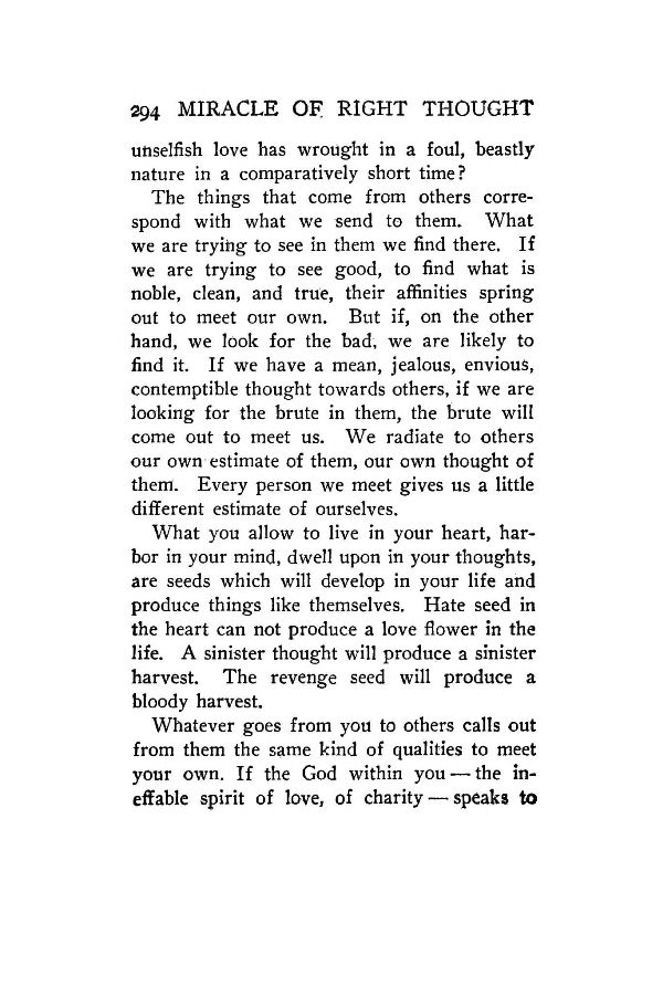 The things that come from others correspond with what we send to them. What we are trying to see in them we find there. If we are trying to see good, to find what is noble, clean, and true, their affinities spring out to meet our own. But if, on the other hand, we look for the bad, we are likely to find it. If we have a mean, jealous, envious, contemptible thought towards others, if we are looking for the brute in them, the brute will come out to meet us. We radiate to others our own estimate of them, our own thought of them. Every person we meet gives us a little different estimate of ourselves.