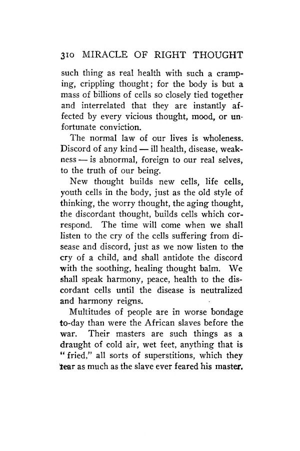 such thing as real health with such a cramping, crippling thought; for the body is but a mass of billions of cells so closely tied together and interrelated that they are instantly affected by every vicious thought, mood, or unfortunate conviction.