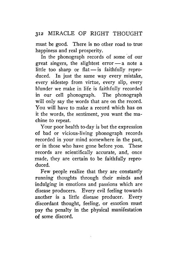 In the phonograph records of some of our great singers, the slightest error — a note a little too sharp or flat — is faithfully reproduced. In just the same way every mistake, every sidestep from virtue, every slip, every blunder we make in life is faithfully recorded in our cell phonograph. The phonograph will only say the words that are on the record. You will have to make a record which has on it the words, the sentiment, you want the machine to repeat.