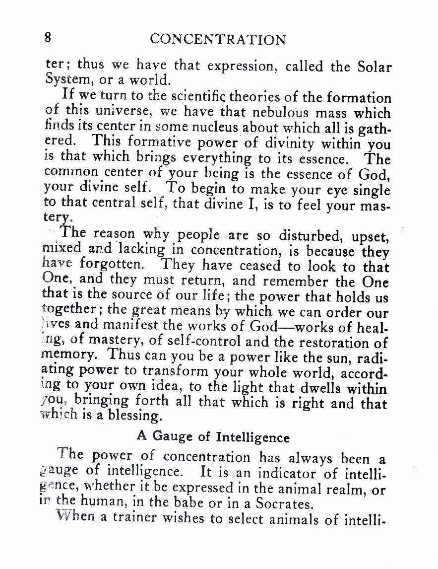 The power of concentration has always been a gauge of intelligence. It is an indicator of intelligence, whether it be expressed in the animal realm, or in the human, in the babe or in a Socrates.