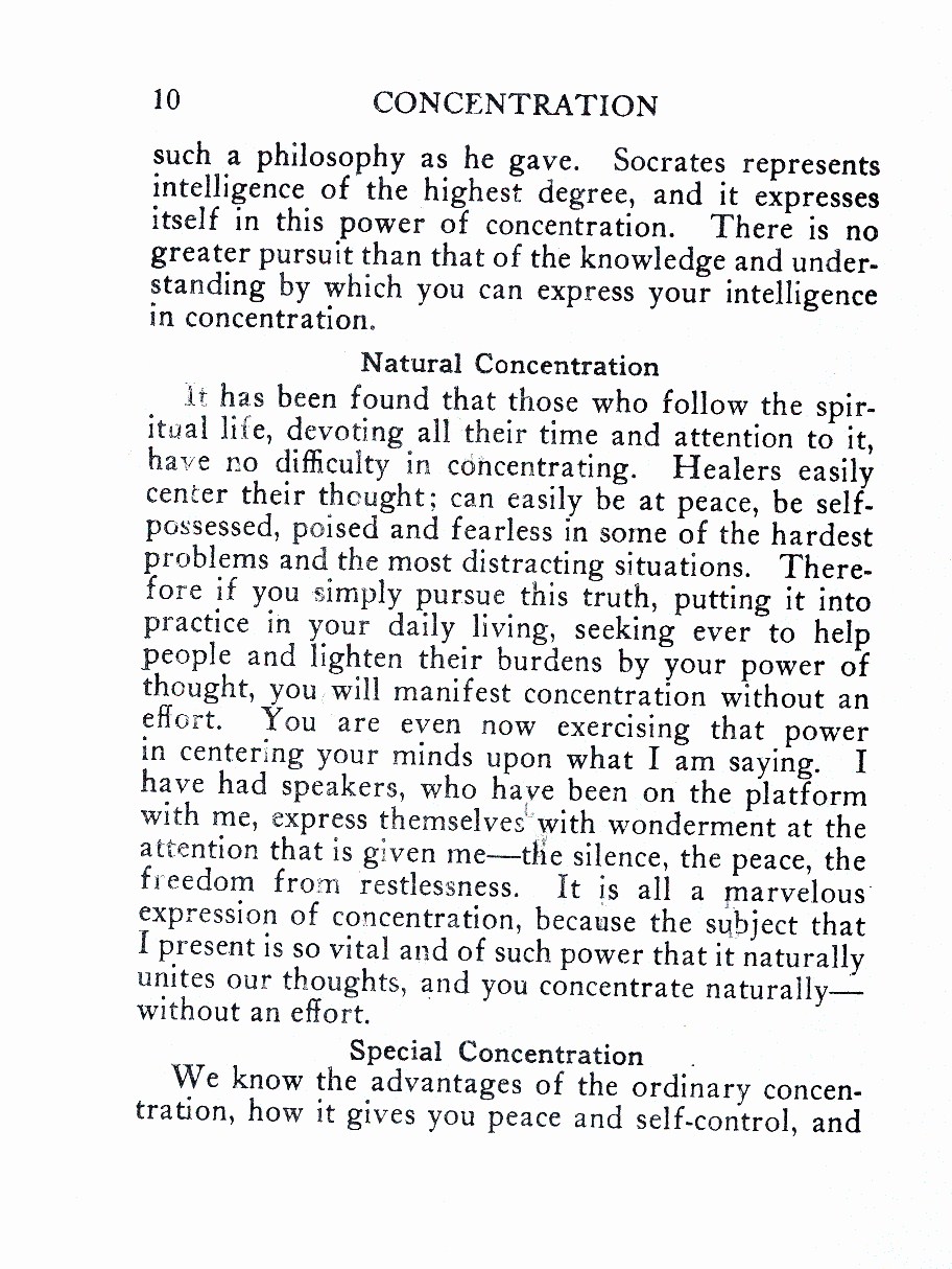 It has been found that those who follow the spiritual life, devoting all their time and attention to it, have no difficulty in concentrating. Healers easily center their thought; can easily be at peace, be self-possessed, poised and fearless in some of the hardest problems and the most distracting situations. Therefore if you simply pursue this truth, putting it into practice in your daily living, seeking ever to help people and lighten their burdens by your power of thought, you will manifest concentration without an effort. You are even now exercising that power in centering your minds upon what I am saying. I have had speakers, who have been on the platform with me, express themselves with wonderment at the attention that is given me--- the silence, the peace, the freedom from restlessness. It is all a marvelous’ expression of concentration, because the subject that I present is so vital and of such power that it naturally unites our thoughts, and you concentrate naturally--- without an effort.
