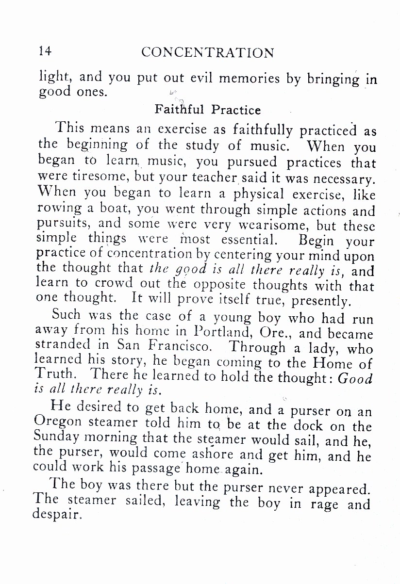 This means an exercise as faithfully practiced as the beginning of the study of music. When you began to learn music, you pursued practices that were tiresome, but your teacher said it was necessary. When you began to learn a physical exercise, like rowing a boat, you went through simple actions and pursuits, and some were very wearisome, but these simple thugs were most essential. Begin your practice of concentration by centering your mind upon the thought that the good is all there really is, and learn to crowd out the opposite thoughts with that one thought. It will prove itself true, presently.