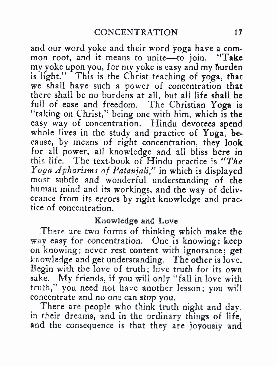 and our word yoke and their word yoga have a common root, and it means to unite--- to join. “Take my yoke upon you, for my yoke is easy and my burden is light.” This is the Christ teaching of yoga, that we shall have such a power of concentration that there shall be no burdens at all, but all life shall be full of ease and freedom. The Christian Yoga is “taking on Christ,” being one with him, which is the easy way of concentration. Hindu devotees spend whole lives in the study and practice of Yoga, because, by means of right concentration, they look for all power, all knowledge and all bliss here in this life. The text-book of Hindu practice is “The Yoga Aphorisms of Patanjali,” in which is displayed most subtle and wonderful understanding of the human mind and its workings, and the way of deliverance from its errors by right knowledge and practice of concentration.