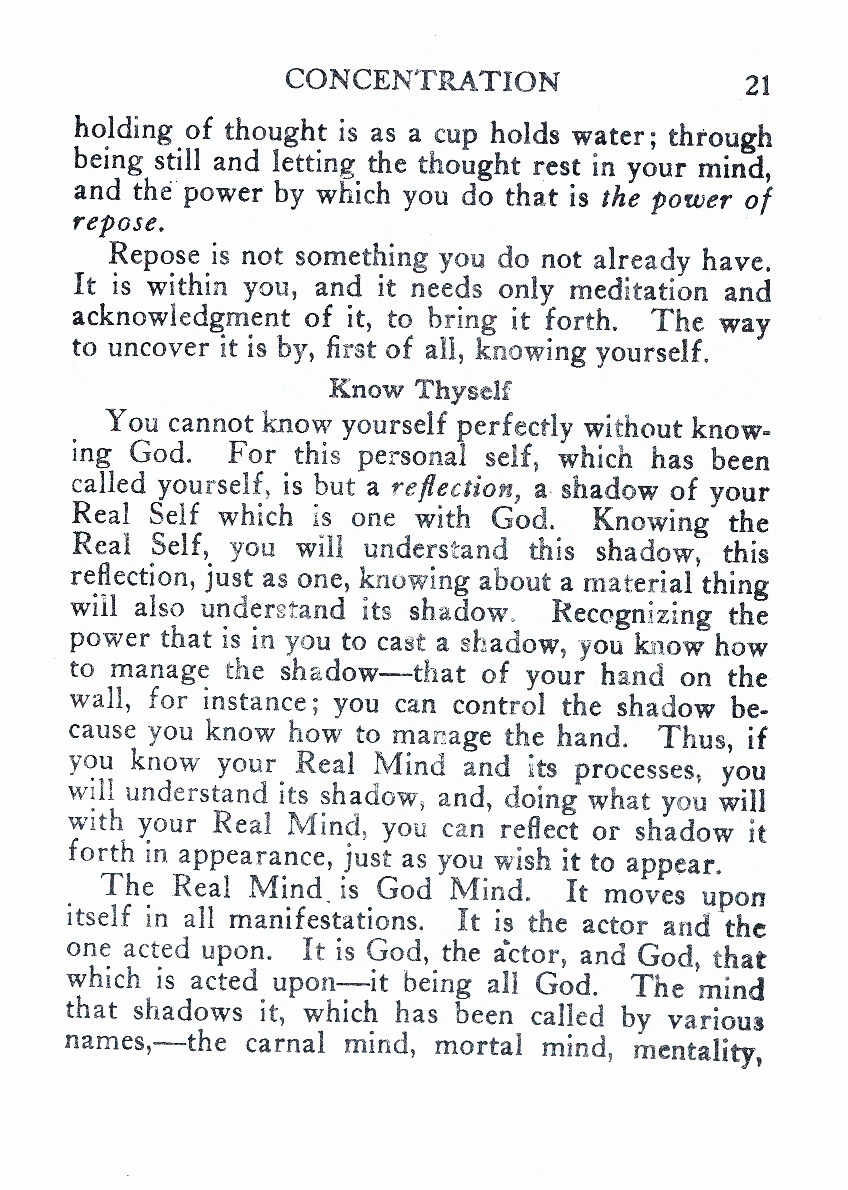 You cannot know yourself perfectly without knowing God. For this personal self, which has been called yourself, is but a reflection, a shadow of your Real Self which is one with God. Knowing the Real Self, you will understand this shadow, this reflection, just as one, knowing about a material thing will also understand its shadow. Recognizing the power that is in you to cast a shadow, you know how to manage the shadow--- that of your hand on the wall, for instance; you can control the shadow because you know how to manage the hand. Thus, if you know your Real Mind and its processes, you will understand its shadow, and, doing what you will with your Real Mind, you can reflect or shadow it forth in appearance, just as you wish it to appear.
