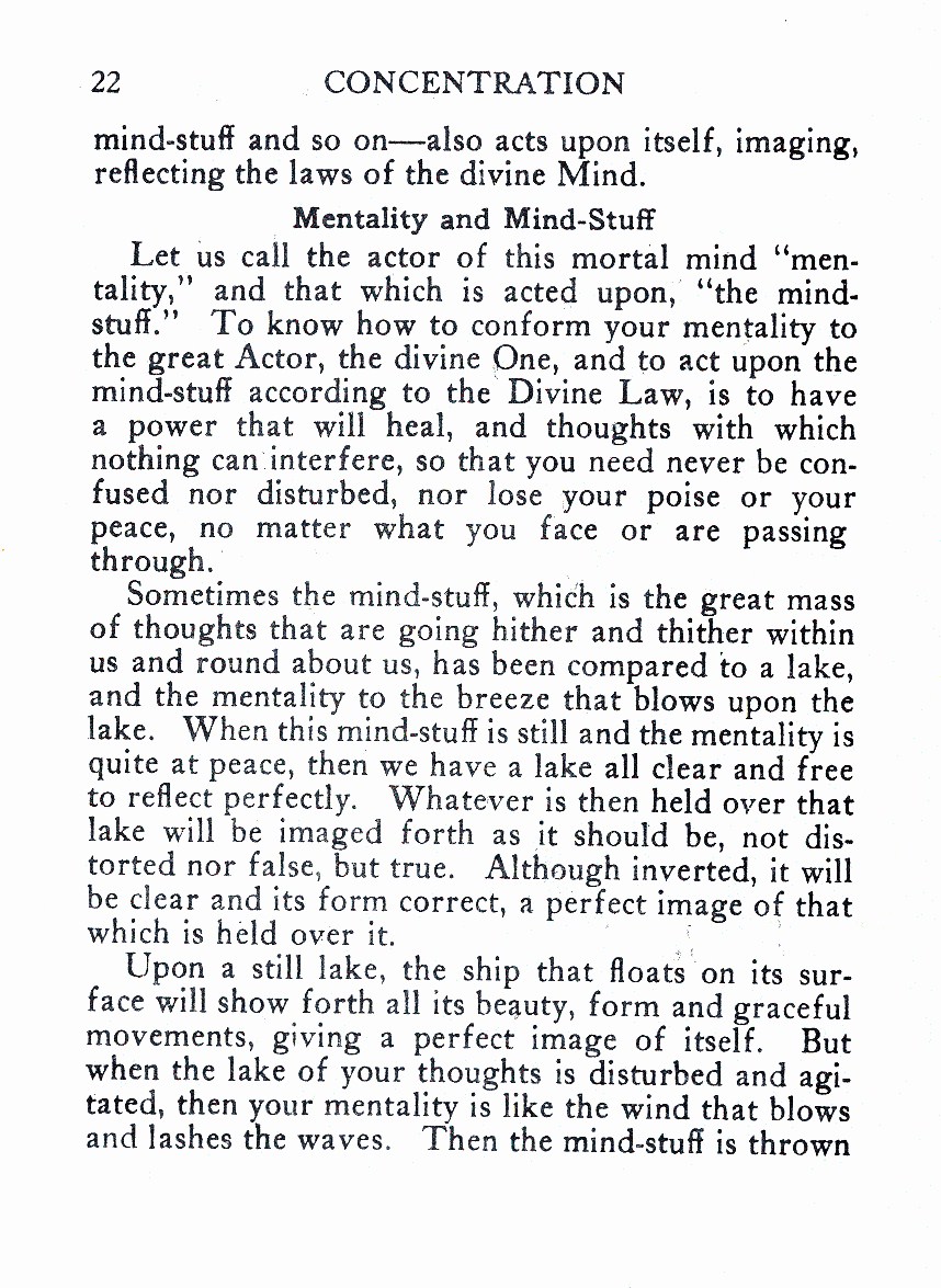 Let us call the actor of this mortal mind “mentality,” and that which is acted upon, “the mind-stuff.” To know how to conform your mentality to the great Actor, the divine One, and to act upon the mind-stuff according to the Divine Law, is to have a power that will heal, and thoughts with which nothing can interfere, so that you need never be confused nor disturbed, nor lose your poise or your peace, no matter what you face or are passing through.