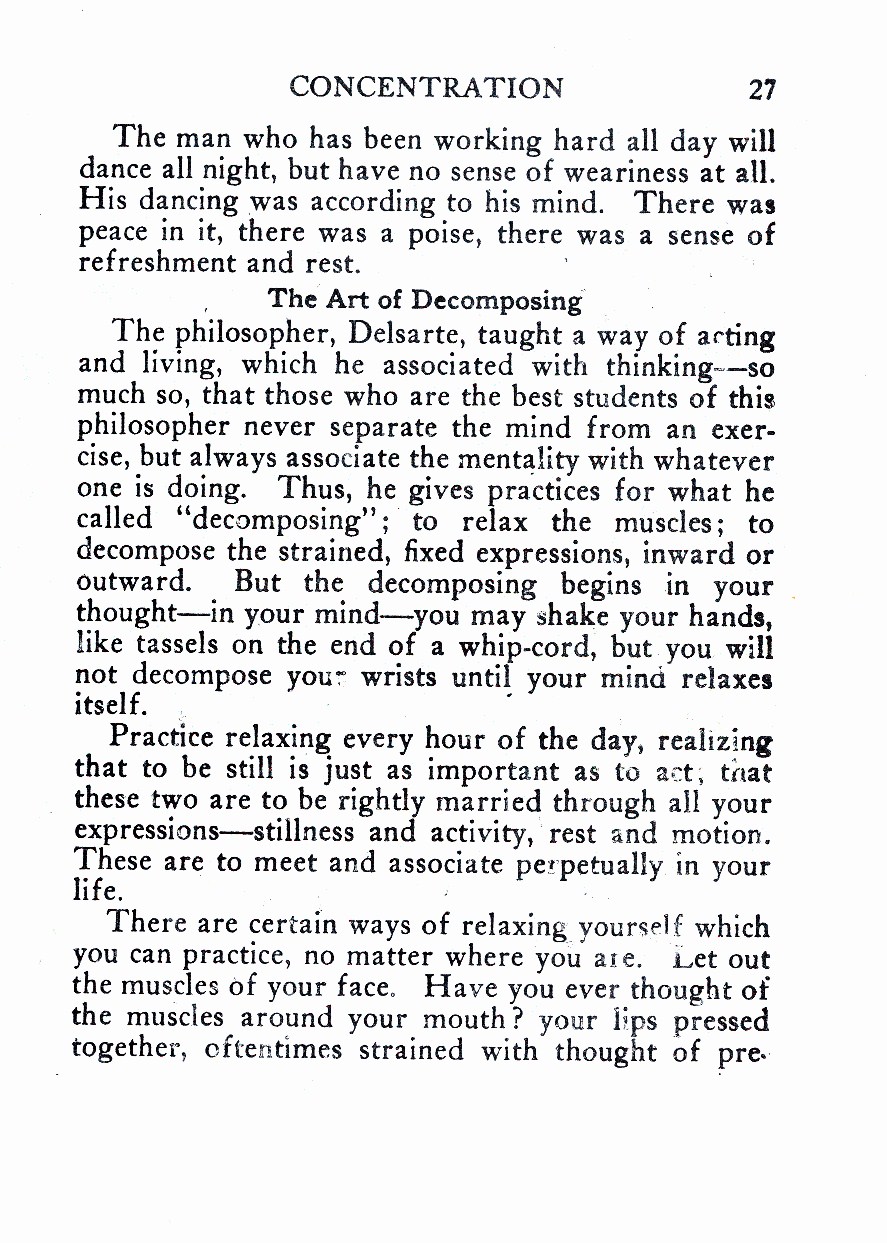 The philosopher, Delsarte, taught a way of acting and living, which he associated with thinking----- so much so, that those who are the best students of this philosopher never separate the mind from an exercise, but always associate the mentality with whatever one is doing. Thus, he gives practices for what he called “decomposing”; to relax the muscles; to decompose the strained, fixed expressions, inward or outward. But the decomposing begins in your thought--- in your mind--- you may shake your hands, like tassels on the end of a whip-cord, but you will not decompose you wrists until your mind relaxes itself.