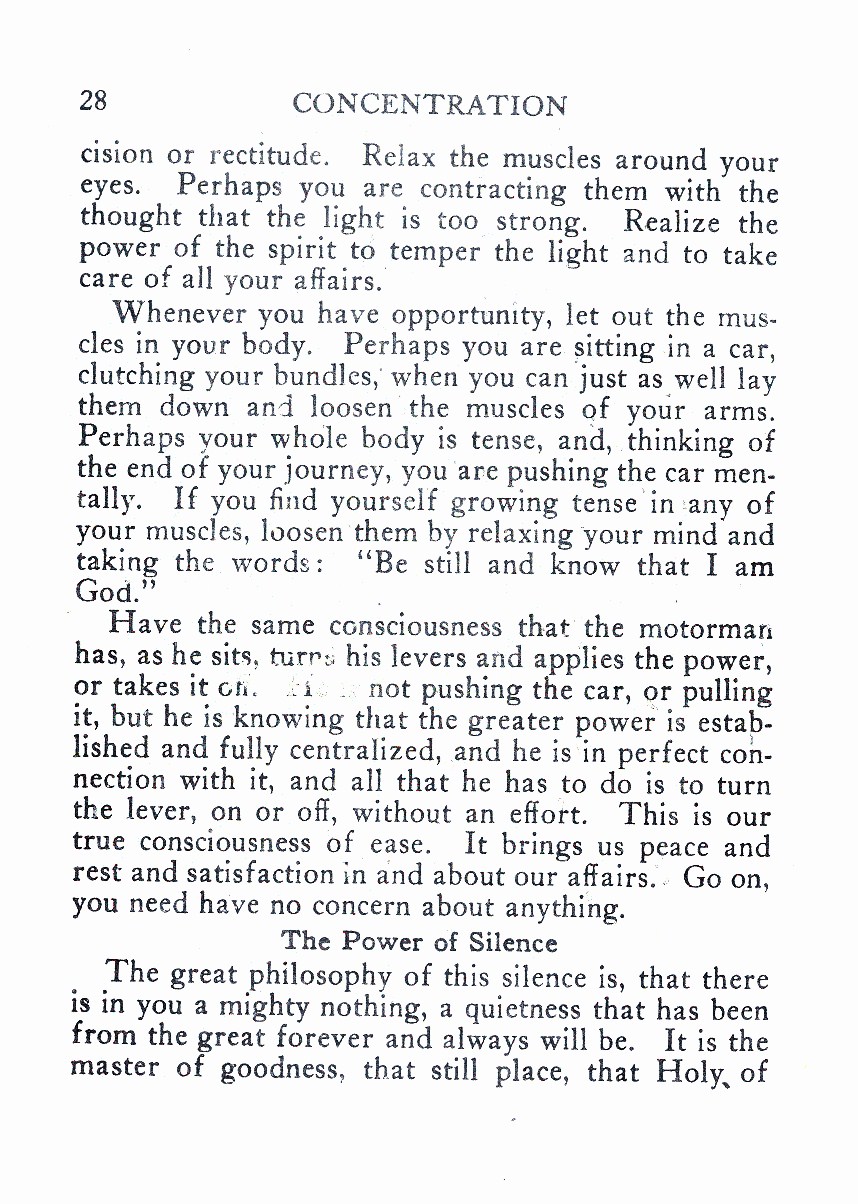 Whenever you have opportunity, let out the muscles in your body. Perhaps you are sitting in a car, clutching your bundles,’ when you can just as well lay them down and loosen the muscles of your arms. Perhaps your whole body is tense, and, thinking of the end of your journey, you are pushing the car mentally. If you find yourself growing tense in any of your muscles, loosen them by relaxing your mind and taking the words: “Be still and know that I am God.”