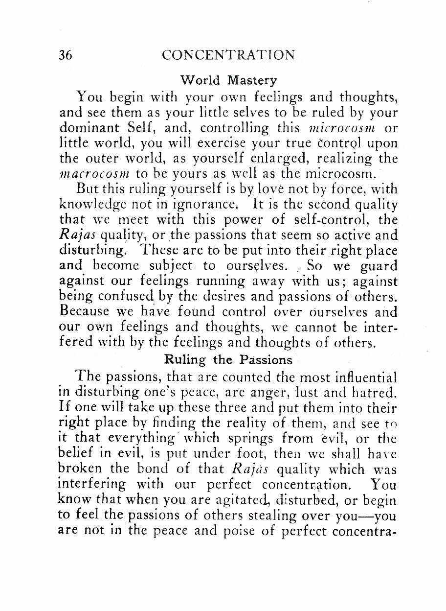 The passions, that are counted the most influential in disturbing one’s peace, are anger, lust and hatred. If one will take up these three and put them into their right place by finding the reality of them, and see to it that everything which springs from ‘evil, or the belief in evil, is put under foot, then we shall have broken the bond of that Rajas quality which was interfering with our perfect concentration. You know that when you are agitated, disturbed, or begin to feel the passions of others stealing over you--- you are not in the peace and poise of perfect concentration.