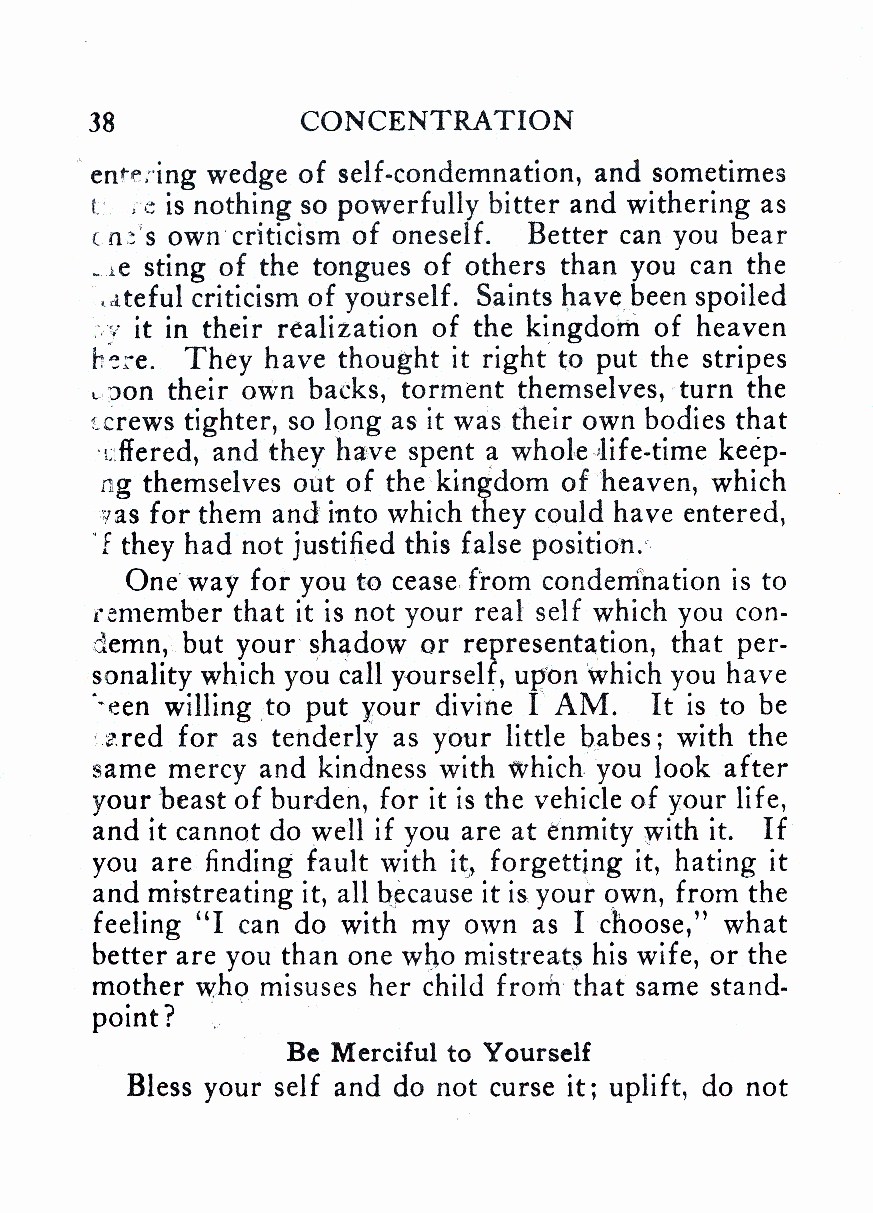 One way for you to cease from condemnation is to remember that it is not your real self which you condemn, but your’ shadow or representation, that personality which you call yourself, upon ‘which you have been willing to put your divine I AM. It is to be cared for as tenderly as your little babes; with the same mercy and kindness with which you look after your beast of burden, for it is the vehicle of your life, and it cannot do well if you are at enmity with it. If you are finding fault with it, forgetting it, hating it and mistreating it, all because it is your own, from the feeling “I can do with my own as I choose,” what better are you than one who mistreats his wife, or the mother who misuses her child from that same standpoint?