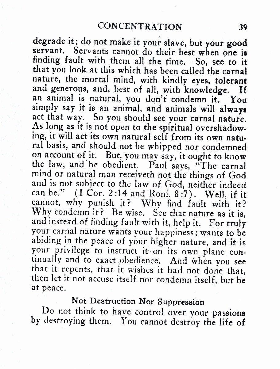 Paul says, “The carnal mind or natural man receiveth not the things of God and is not subject to the law of God, neither ‘indeed can be.” (I Cor. 2:14 and Rom. 8:7). Well, if it cannot, why punish it? Why find fault with it? Why condemn it? Be wise. See that nature as it is, and instead of finding fault with it, help it. For truly your carnal nature wants your happiness; wants to be abiding in the peace of your higher nature, and it is your privilege to instruct it on its own plane continually and to exact obedience. And when you see that it repents, that it wishes it had not done that, then let it not accuse itself nor condemn itself, but be at peace.