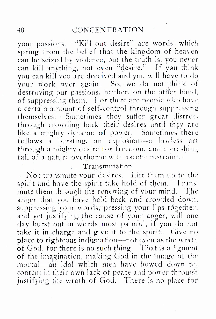 your passions. “Kill out desire” are words, which spring from the belief that the kingdom of heaven can be seized by violence, but the truth is, you never can kill anything, not even “desire.” if you think you can kill you are deceived and you will have to do your work over again. So, we do not think of destroying our passions, neither, on the other hand, of suppressing them. For there are people who have a certain amount of self-control through suppressing themselves. Sometimes they suffer great distress through crowding hack their desires until they are like a mighty dynamo of power. Sometimes there follows a bursting. an explosion--- a lawless act through a mighty desire for freedom and a crashing fall of a nature overborne with ascetic restraint.