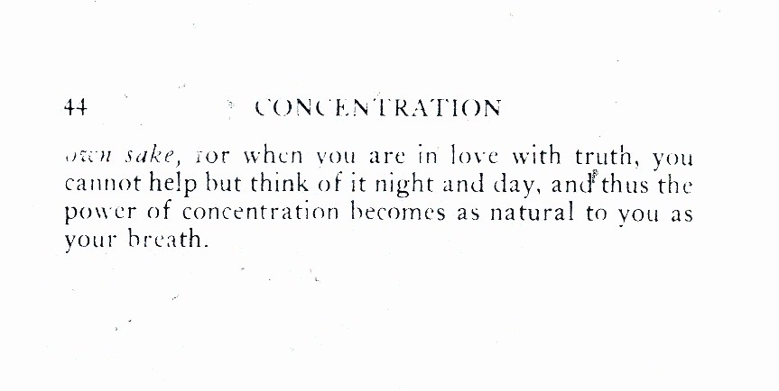 own sake, for when you are in love with truth, you cannot help but think of it night and day, and thus the power of concentration becomes as natural to you as your breath.
