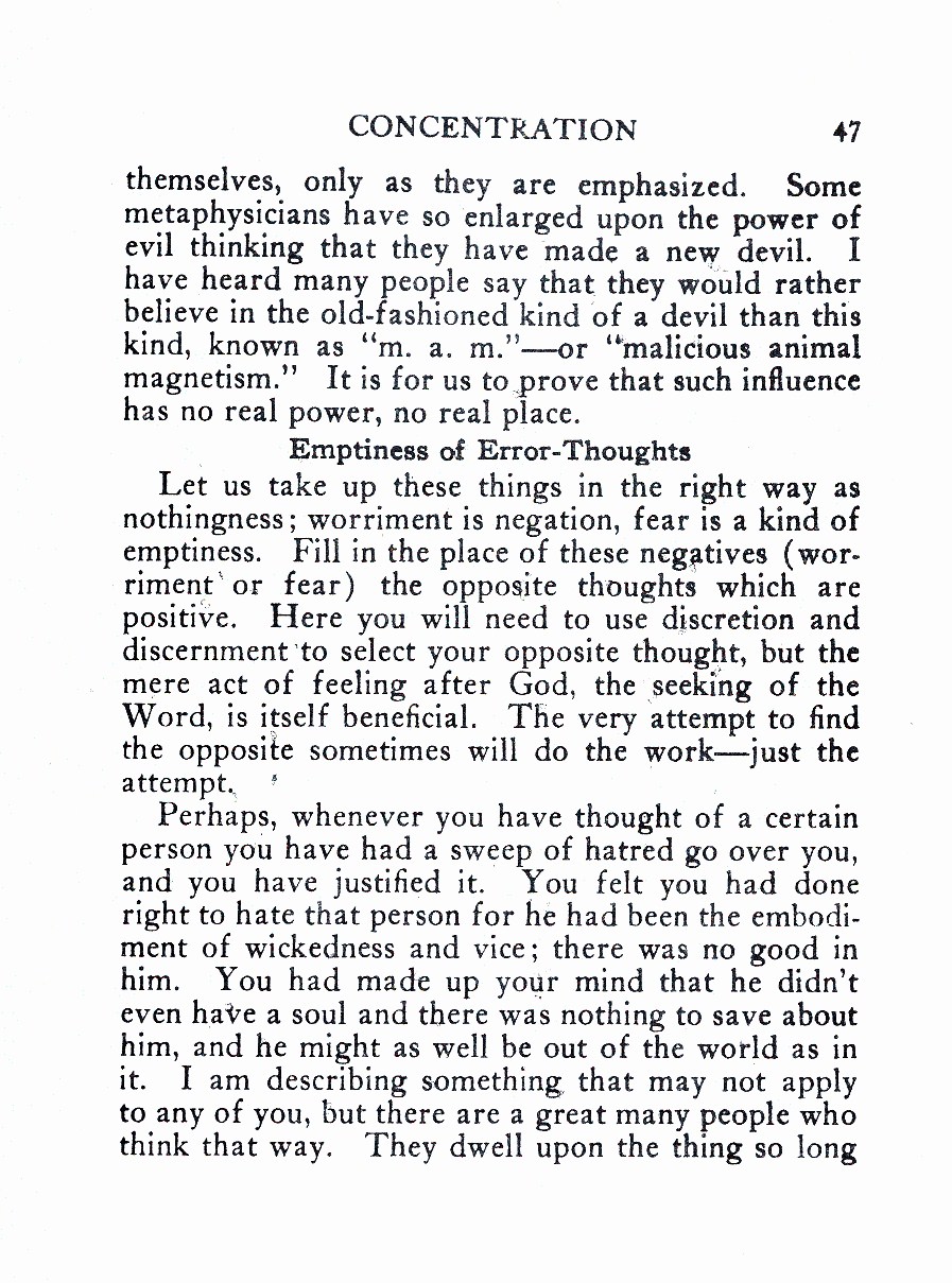 themselves, only as they are emphasized. Some metaphysicians have so enlarged upon the power of evil thinking that they have made a new devil. I have heard many people say that they would rather believe in the old-fashioned kind of a devil than this kind, known as