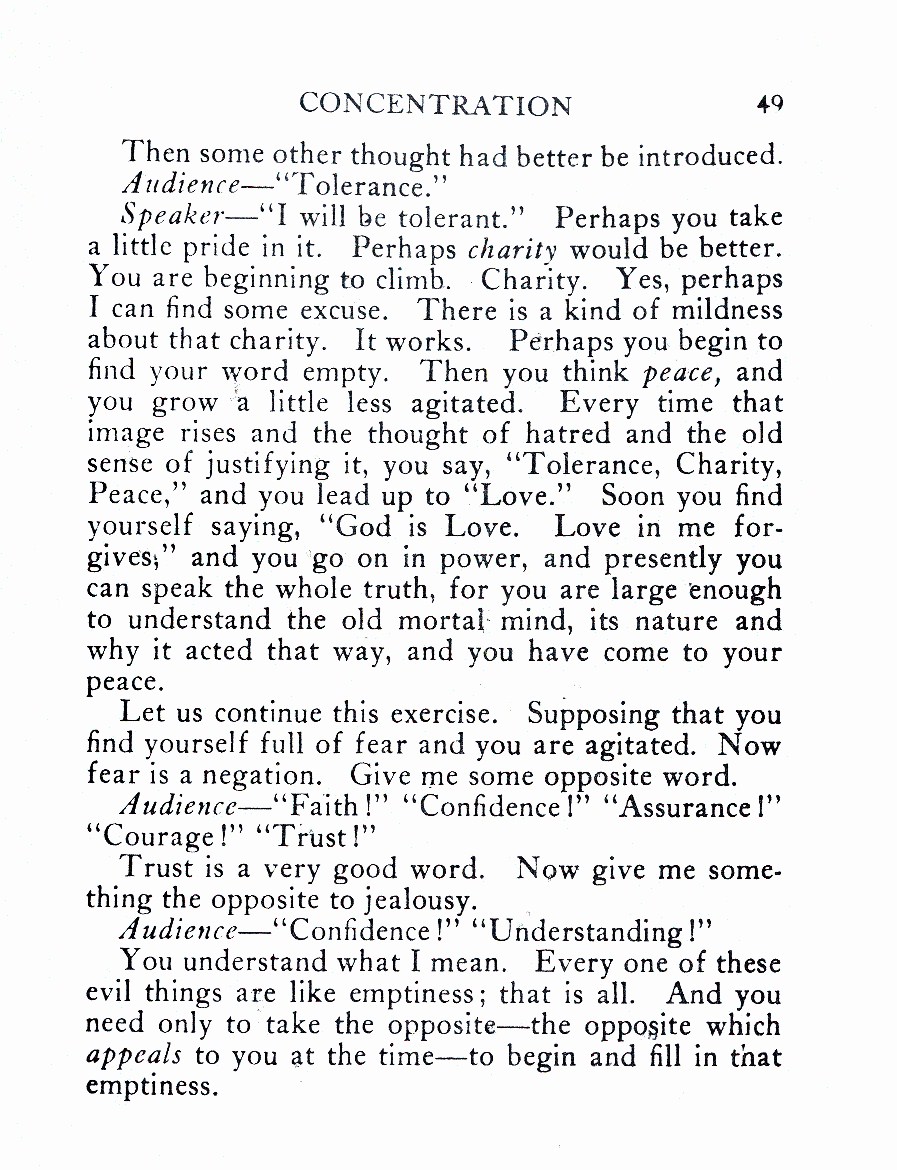 Speaker--- ”I will be tolerant.” Perhaps you take a little pride in it. Perhaps charity would be better. You are beginning to climb. Charity. Yes, perhaps I can find some excuse. There is a kind of mildness about that charity. It works. Perhaps you begin to find your word empty. Then you think peace, and you grow a little less agitated. Every time that image rises and the thought of hatred and the old sense of justifying it, you say, “Tolerance, Charity, Peace,” and you lead up to “Love.” Soon you find yourself saying, “God is Love. Love in me forgives;” and you go on in power, and presently you can speak the whole truth, for you are large enough to understand the old mortal mind, its nature and why it acted that way, and you have come to your peace.