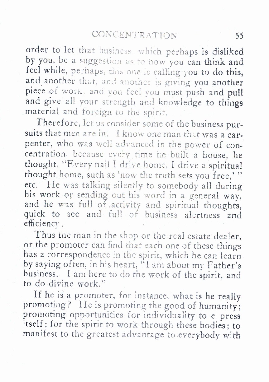 Therefore, let us consider some of the business pure suits that men are in. I know one man that was a carpenter, who was well advanced in the power of concentration, because every time he bulk a house, he thought, “Every nail I drive home, I drive a spiritual thought home, such as ‘now the truth sets you free,’” etc. He was talking silently to somebody all during his work or sending out his word in a general way, and he was full of activity and spiritual thoughts, quick to see and full of business alertness and efficiency.