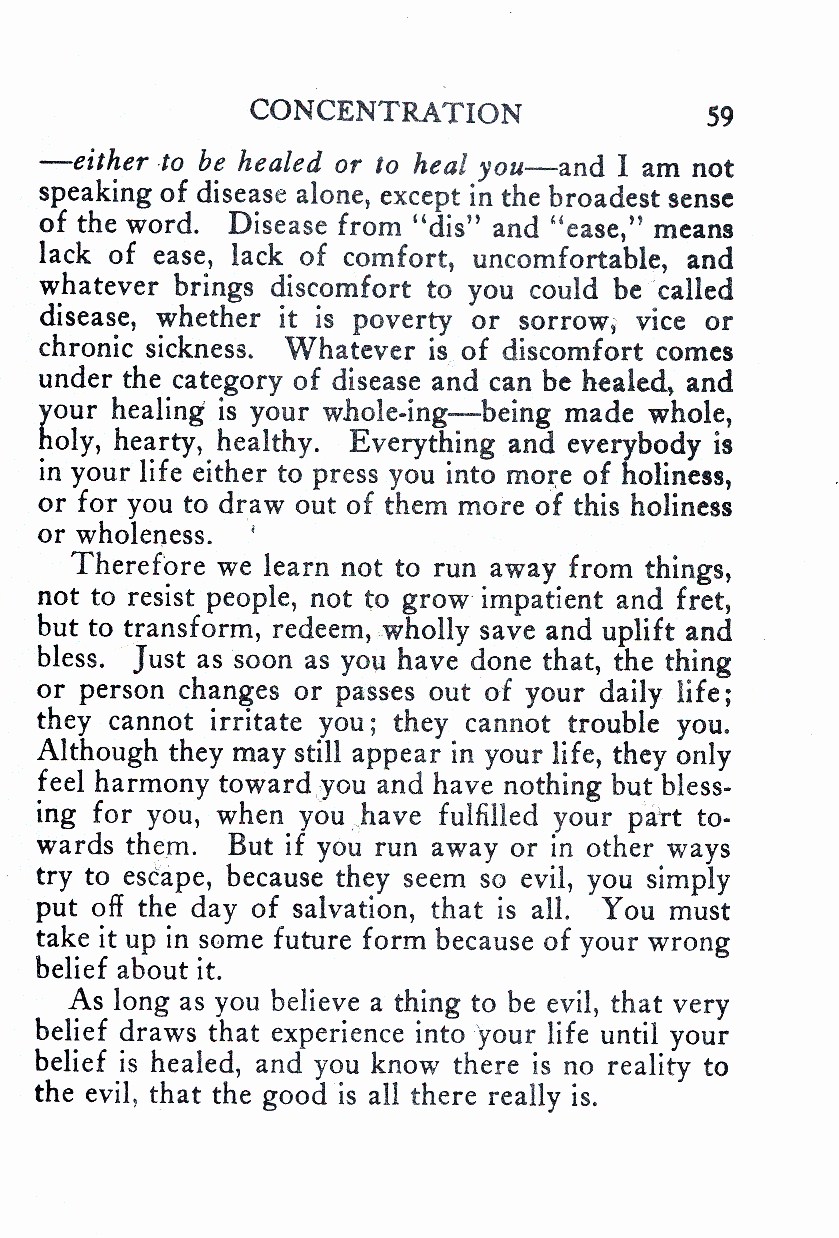 --- either to be healed or to heal you--- and I am not speaking of disease alone, except in the broadest sense of the word. Disease from “dis” and “ease,” means lack of ease, lack of comfort, uncomfortable, and whatever brings discomfort to you could be called disease, whether it is poverty or sorrow, vice or chronic sickness. Whatever is of discomfort comes under the category of disease and can be healed, and your healing is your whole-ing --- being made whole, holy, hearty, healthy. Everything and everybody is in your life either to press you into more of holiness, or for you to draw out of them more of this holiness or wholeness.