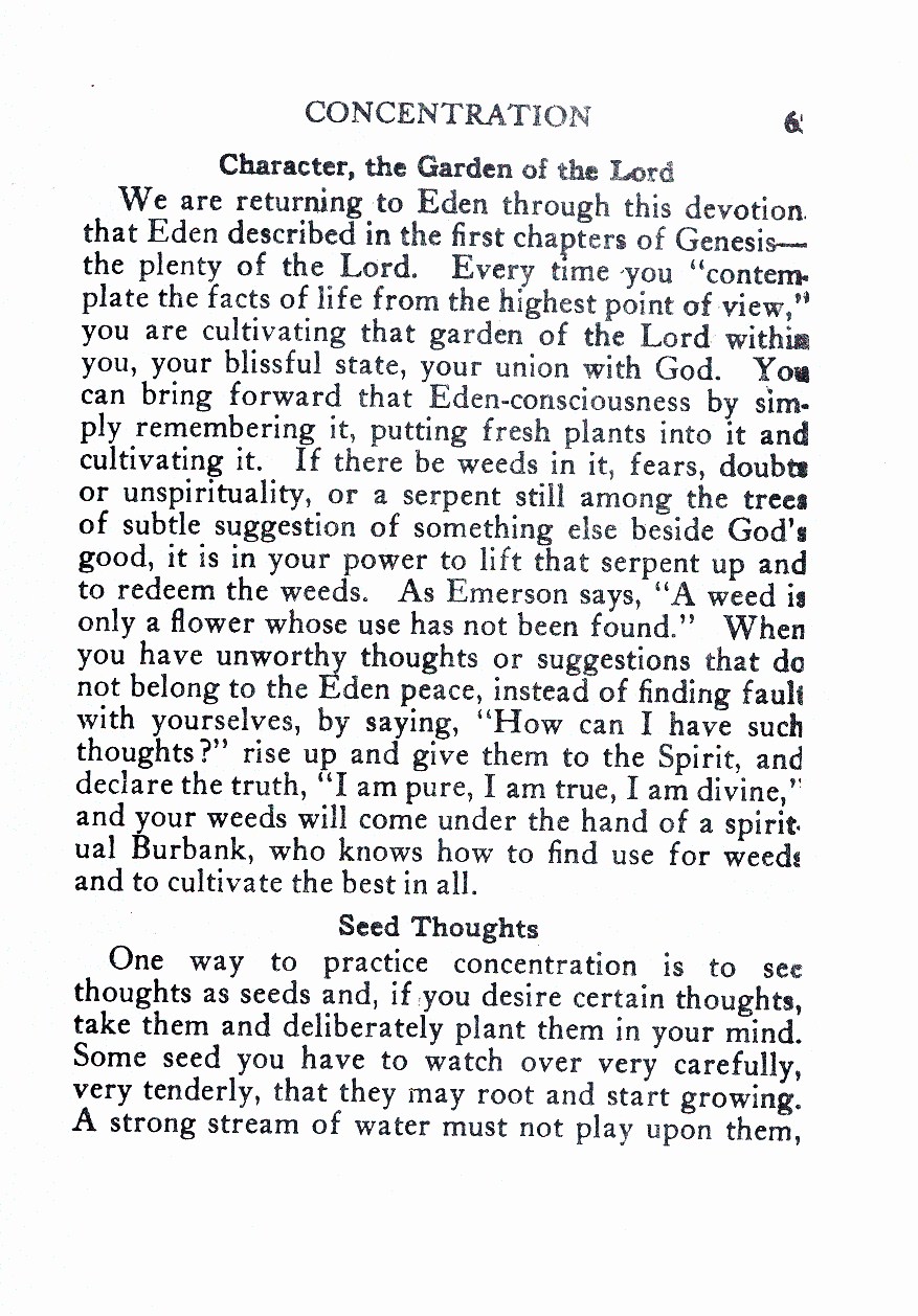 We are returning to Eden through this devotion. that Eden described in the first chapters of Genesis--- the plenty of the Lord. Every time you “contemplate the facts of life from the highest point of view," you are cultivating that garden of the Lord within you, your blissful state, your union with God. You can bring forward that Eden-consciousness by simply remembering it, putting fresh plants into it and cultivating it. If there be weeds in it, fears, doubts or unspirituality, or a serpent still among the trees of subtle suggestion of something else beside God’s good, it is in your power to lift that serpent up and to redeem the weeds. As Emerson says, “A weed is only a flower whose use has not been found.” When you have unworthy thoughts or suggestions that do not belong to the Eden peace, instead of finding fault with yourselves, by saying, “How can I have such thoughts?” rise up and give them to the Spirit, and declare the truth, “I am pure, I am true, I am divine,’ and your weeds will come under the hand of a spiritual Burbank, who knows how to find use for weeds and to cultivate the best in all.