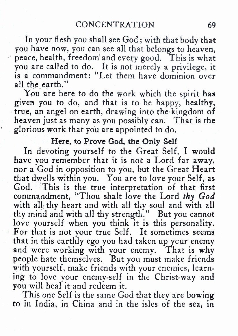 In devoting yourself to the Great Self, I would have you remember that it is not a Lord far away, nor a God in opposition to you, but the Great Heart that dwells within you. You are to love your Self, as God. This is the true interpretation of that first commandment, “Thou shalt love the Lord thy God with all thy heart and with all thy soul and with all thy mind and with all thy strength.” But you cannot love yourself when you think it is this personality. For that is not your true Self. It sometimes seems that in this earthly ego you had taken up your enemy and were working with your enemy. That is why people hate themselves. But you must make friends with yourself, make friends with your enemies, learning to love your enemy-self in the Christ-way and you will heal it and redeem it.