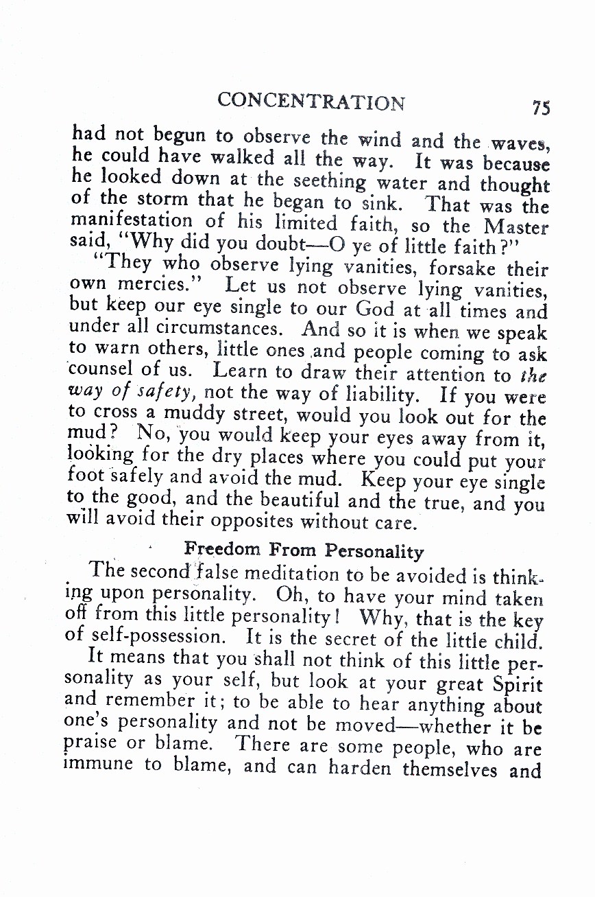 The second false meditation to be avoided is thinking upon personality. Oh, to have your mind taken off from this little personality! Why, that is the key of self-possession. It is the secret of the little child.