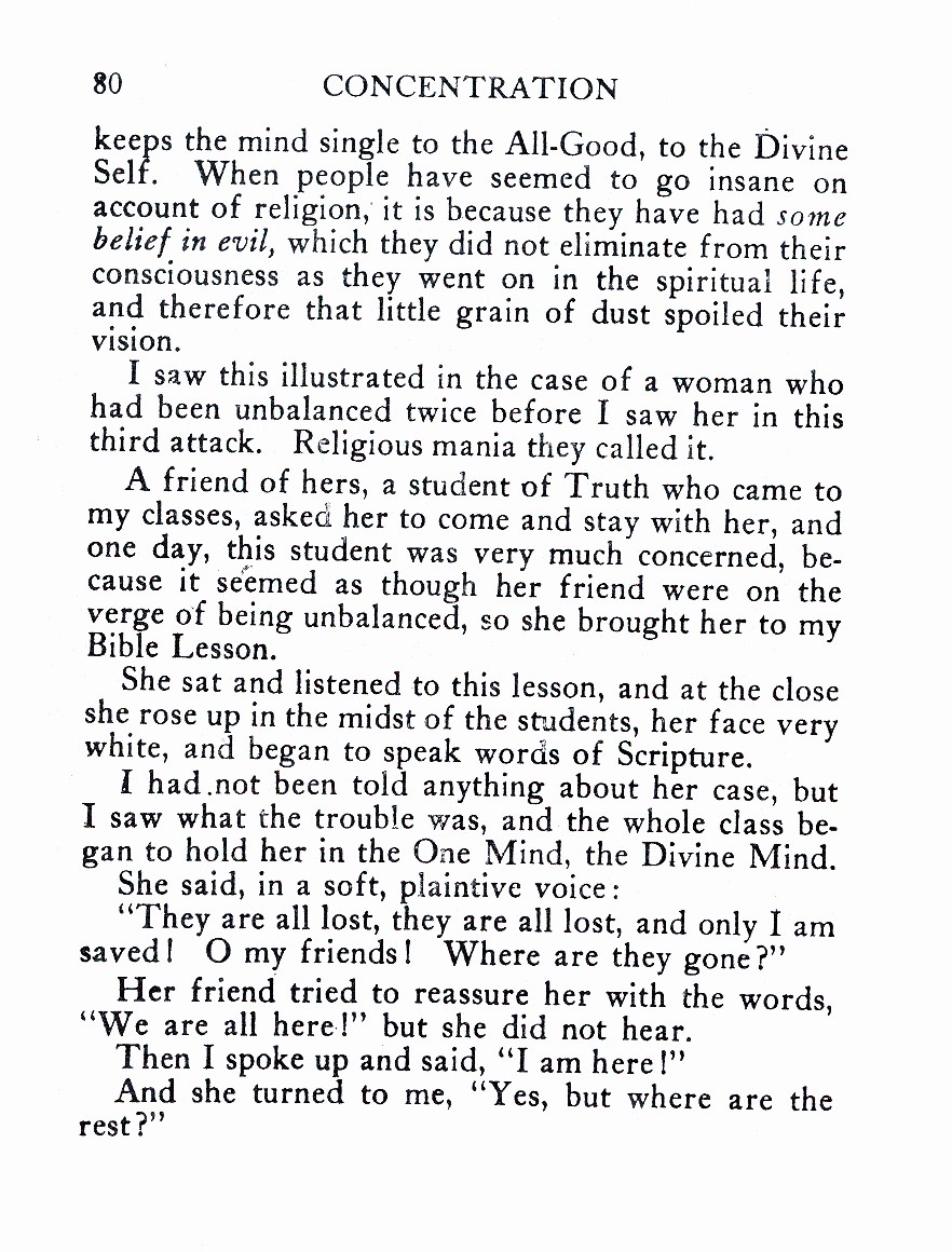 A friend of hers, a student of Truth who came to my classes, asked her to come and stay with her, and one day, this student was very much concerned, because it seemed as though her friend were on the verge of being unbalanced, so she brought her to my Bible Lesson.