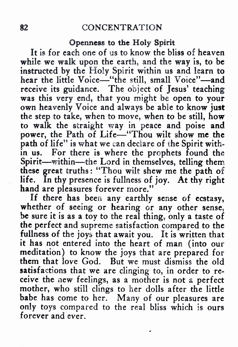 It is for each one of us to know the bliss of heaven while we walk upon the earth, and the way is, to be instructed by the Holy Spirit within us and learn to hear the little Voice--- ”the still, small Voice”--- and receive its guidance. The object of Jesus’ teaching was this very end, that you might be open to your own heavenly Voice and always be able to know just the step to take, when to move, when to be still, how to walk the straight way in peace and poise and power, the Path of Life--- ”Thou wilt show me the path of life” is what we can declare of the Spirit with in us. For there is where the prophets found the Spirit--- within---- the Lord in themselves, telling them these great truths: “Thou wilt shew me the path of life. In thy presence is fullness of joy. At thy right hand are pleasures forever more.”