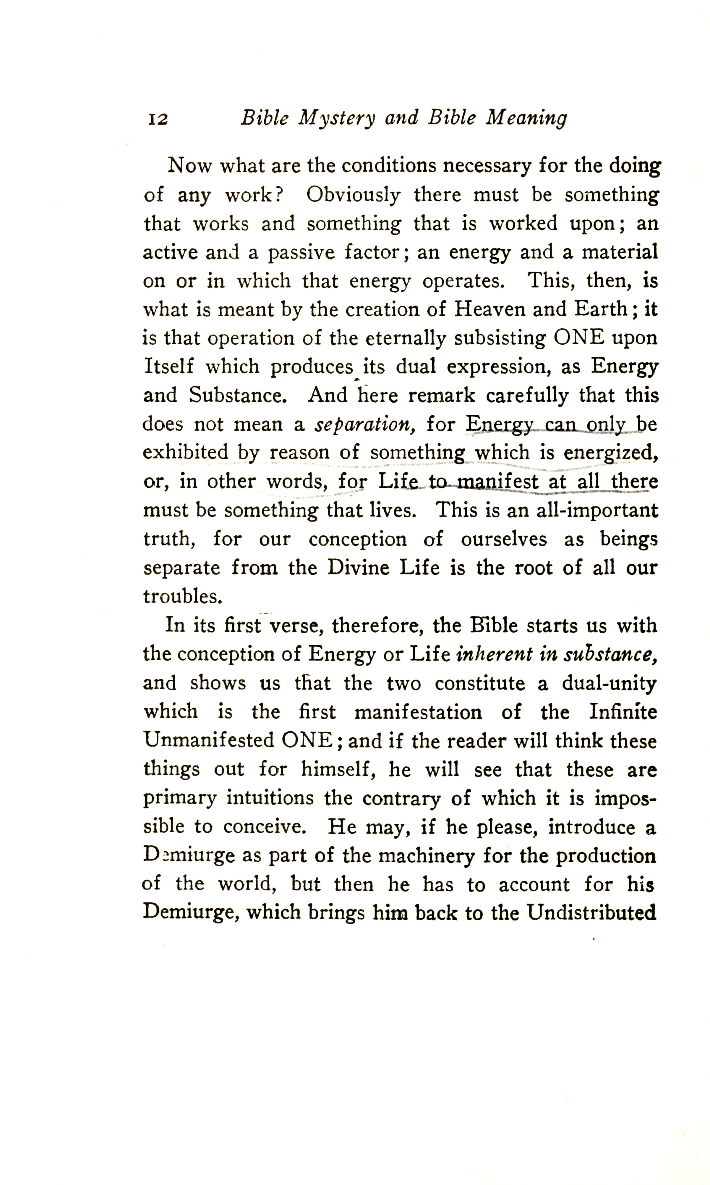 In its first verse, therefore, the Bible starts us with the conception of Energy or Life inherent in substance and shows us that the two constitute a dual-unity which is the first manifestation of the Infinite Unmanifested ONE; and if the reader will think these things out for himself, he will see that these are primary intuitions the contrary of which it is impossible to conceive. He may, if he please, introduce a Demiurge as part of the machinery for the production of the world, but then he has to account for this Demiurge, which brings him back to the Undistributed