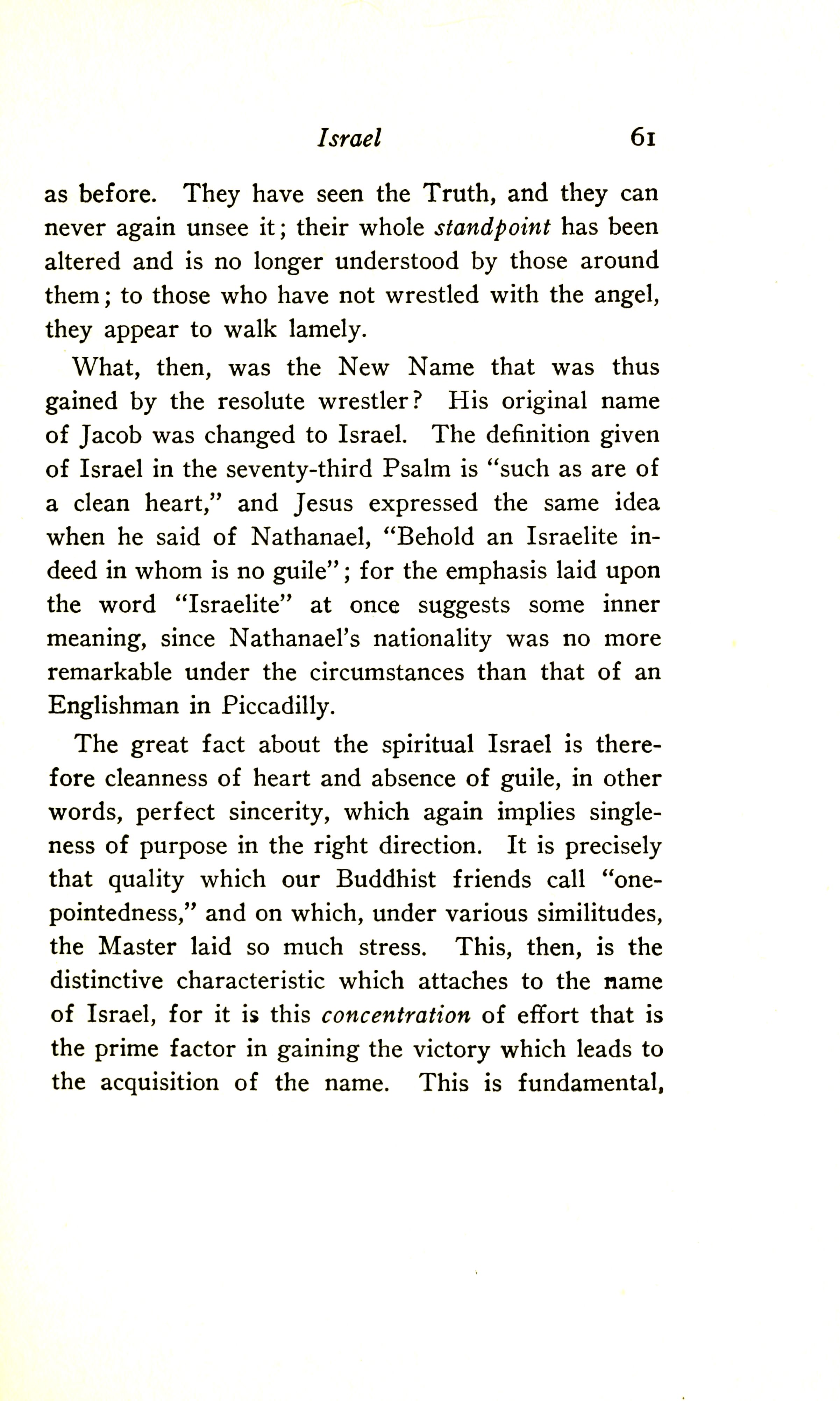 The great fact about the spiritual Israel is therefore cleanness of heart and absence of guile --- in other words, perfect sincerity, which again implies singleness of purpose in the right direction. It is precisely that quality which our Buddhist friends call "one-pointedness", and on which, under various similitudes, the Master laid so much stress. This, then, is the distinctive characteristic which attaches to the name of Israel, for it is this concentration of effort that is the prime factor in gaining the victory which leads to the acquisition of the Name. This is fundamental,