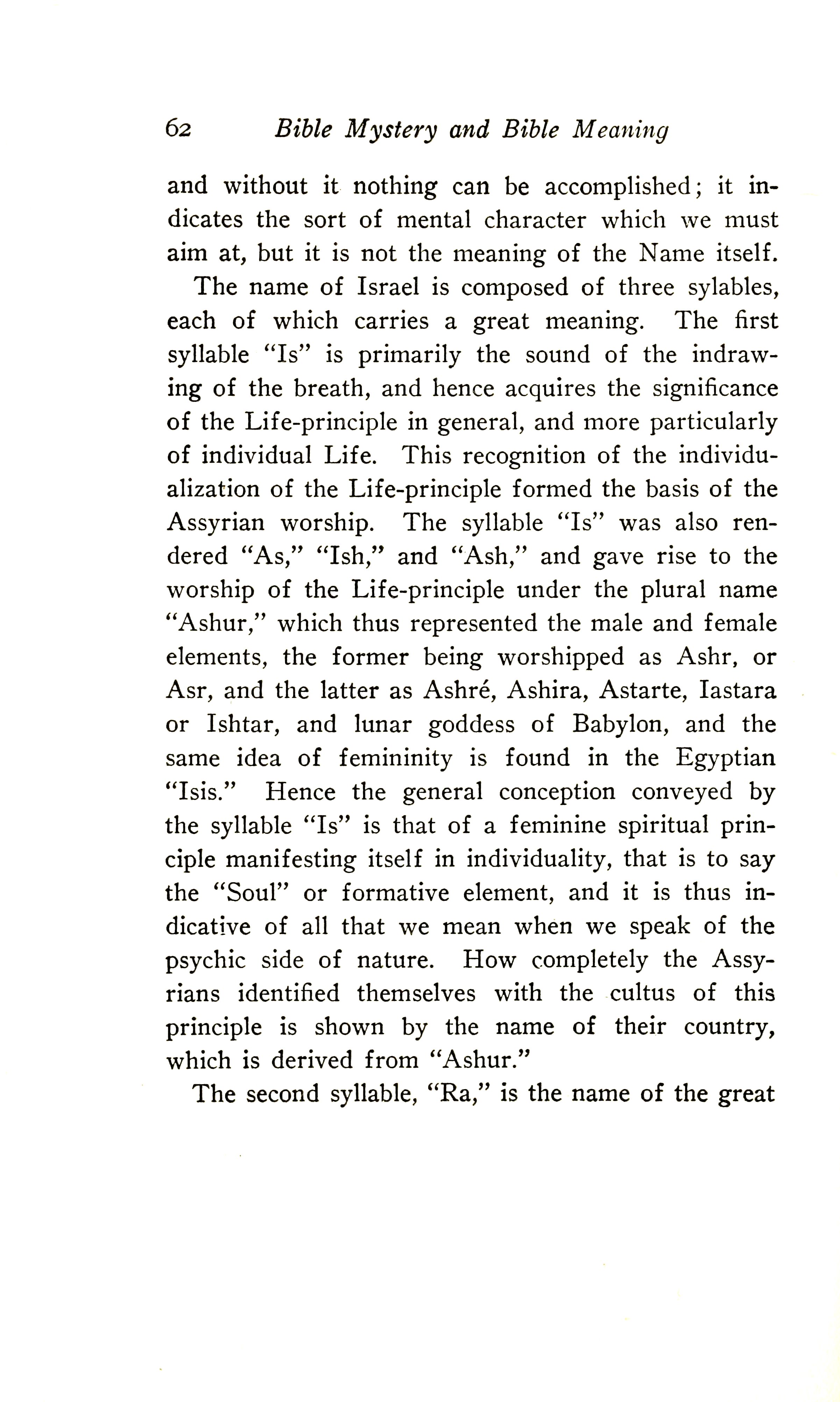 The name of Israel is composed of three syllables, each of which carries a great meaning. The first syllable, "Is", is primarily the sound of the in-drawing of the breath, and hence acquires the significance of the Life-Principle in general, and more particularly of the individual Life. This recognition of the individualisation of the Life-Principle formed the basis of Assyrian worship. The syllable "Is" was also rendered "As", "Ish", and "Ash", and gave rise to the worship of the Life-Principle under the plural name "Ashur", which thus represented the male and female elements, the former being worshipped as Ashr, or Asr, and the latter as Ashre, Ashira, Astarte, Iastara or Ishtar, a lunar goddess of Babylon, and the same idea of femininity is found in the Egyptian "Isis". Hence the general conception conveyed by the syllable "Is" is that of a feminine spiritual principle manifesting itself in individuality --- that is to say, the "Soul" or formative element --- and it is thus indicative of all that we mean when we speak of the psychic side of nature. How completely the Assyrians identified themselves with the cultus of this principle is shown by the name of their country, which is derived from "Ashur".