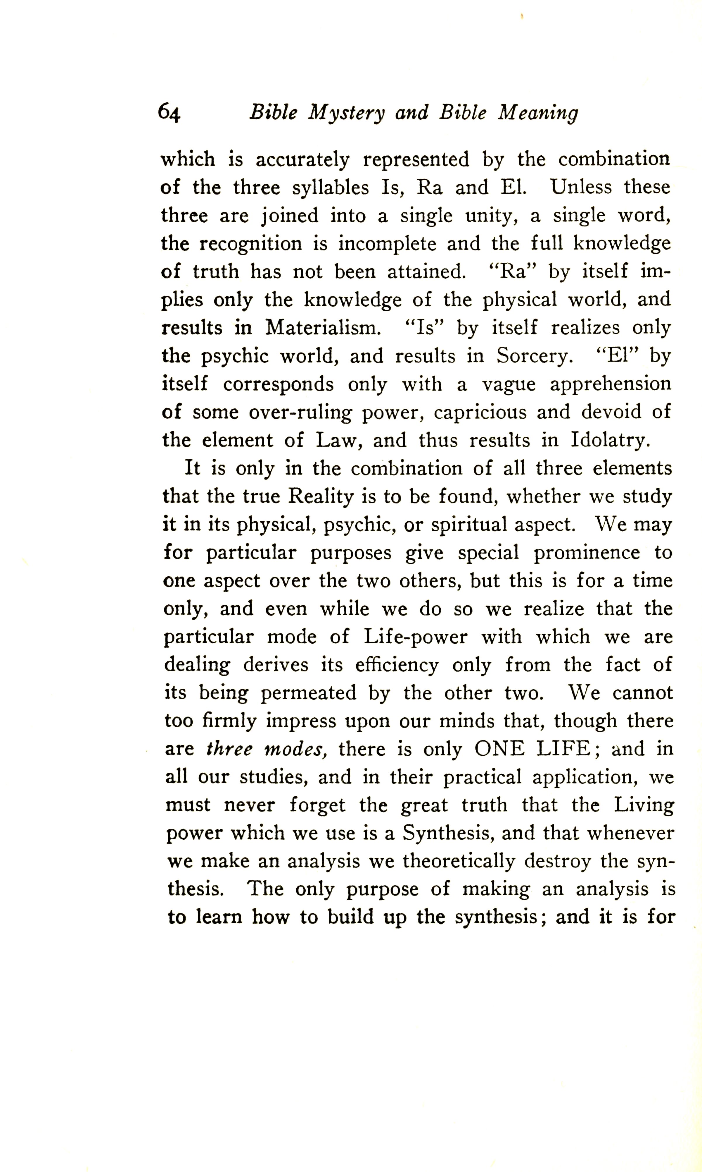It is only in the combination of all three elements that the true Reality is to be found, whether we study it in its physical, psychic, or spiritual aspect. We may for particular purposes give special prominence to one aspect over the two others, but this is for a time only, and even while we do so, we realise that the particular mode of Life-Power with which we are dealing derives its efficiency only from the fact of its being permeated by the other two. We cannot too firmly impress upon our minds that, though there are three modes, there is only ONE LIFE; and in all our studies, and in their practical application, we must never forget the great truth that the Living Power which we use is a Synthesis, and that whenever we make an analysis we theoretically destroy the synthesis. The only purpose of making an analysis is to learn how to build up the synthesis; and it is for