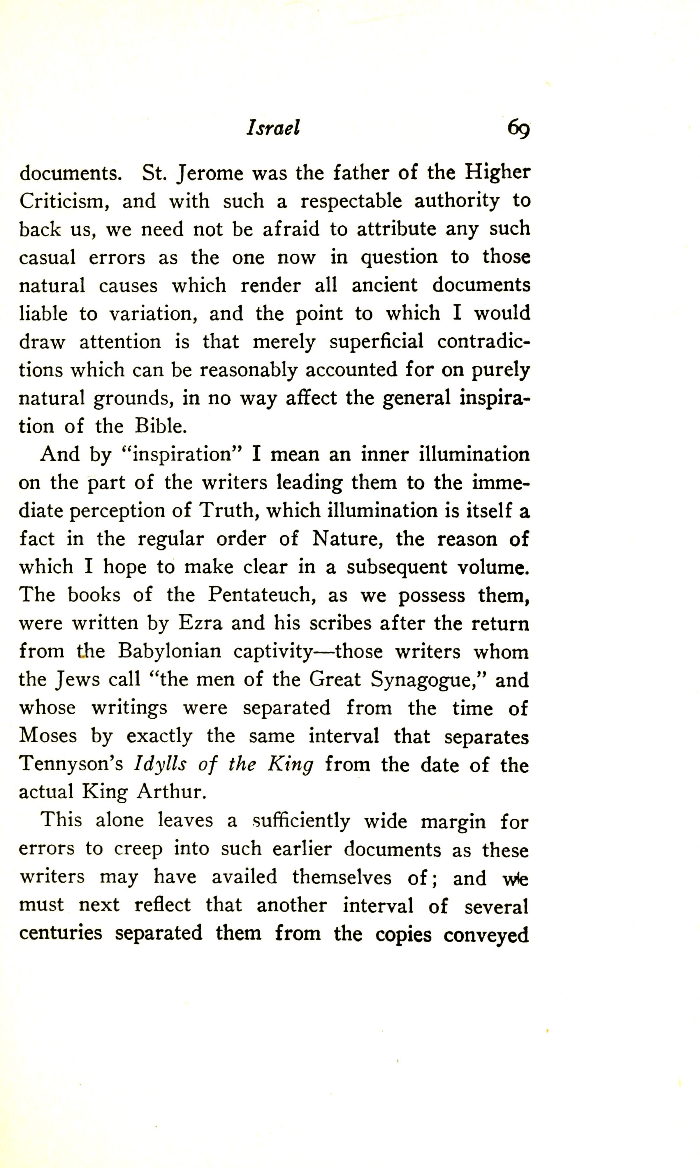 documents. St Jerome was the father of the Higher Criticism, and with such a respectable authority to back us, we need not be afraid to attribute any such casual errors as the one now in question to those natural causes which render all ancient documents liable to variation, and the point to which I would draw attention is that merely superficial contradictions which can be reasonably accounted for on purely natural grounds in no way affect the general inspiration of the Bible. And by "inspiration" I mean an inner illumination on the part of the writers leading them to the immediate perception of Truth, which illumination is itself a fact in the regular order of Nature, the reason of which I hope to make clear in a subsequent volume. The books of the Pentateuch, as we possess them, were written by Ezra and his scribes after the return from the Babylonian captivity --- those writers whom the Jews call "the men of the Great Synagogue", and whose writings were separated from the time of Moses by exactly the same interval that separates Tennyson's Idylls of the King from the date of the actual King Arthur. This alone leaves a sufficiently wide margin for errors to creep into such earlier documents as these writers may have availed themselves of; and we must next reflect that another interval of several centuries separated them from the copies conveyed