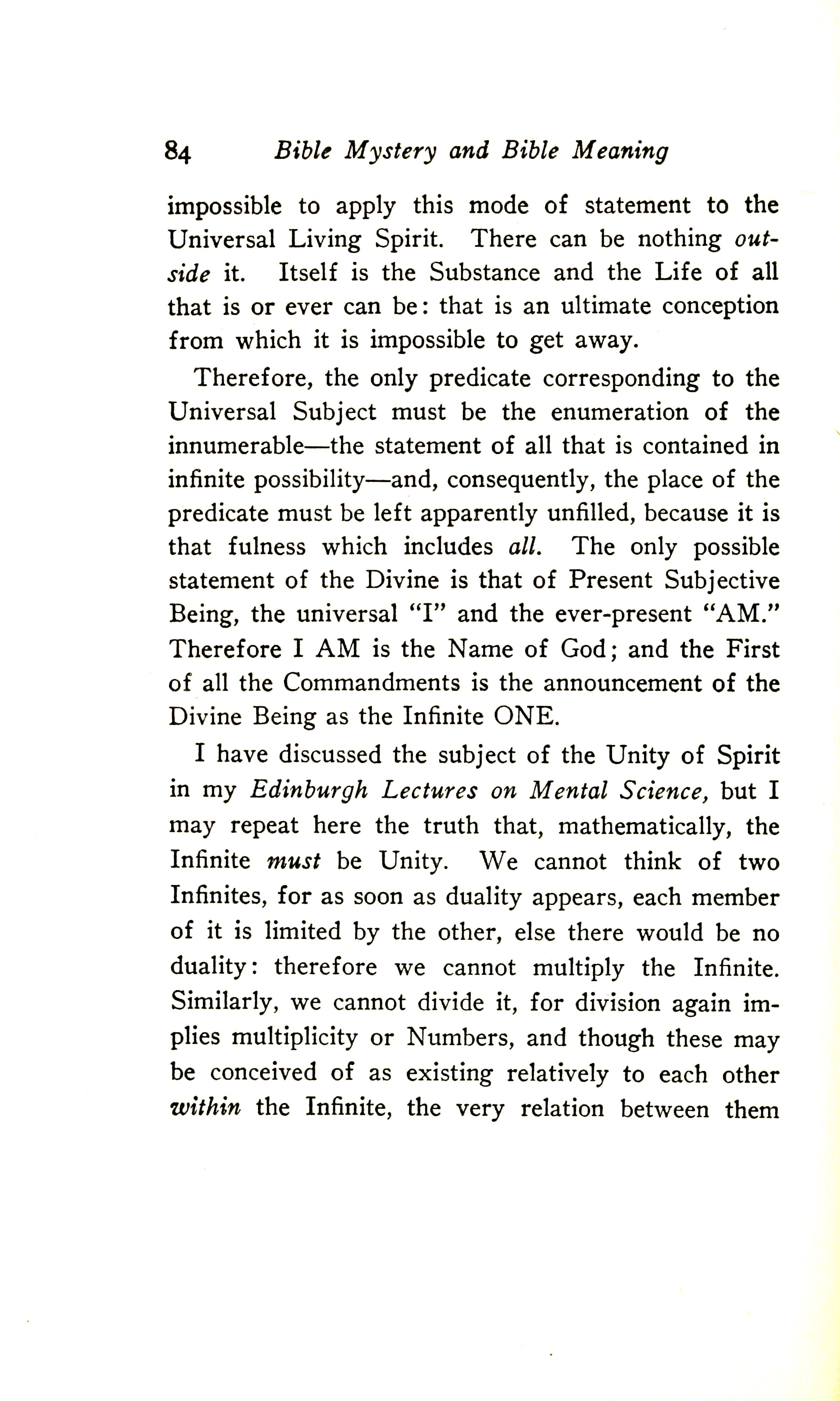 Therefore, the only predicate corresponding to the Universal Subject must be the enumeration of the innumerable --- the statement of all that is contained in infinite possibility --- and, consequently, the place of the predicate must be left apparently unfilled, because it is the fullness which includes all. The only possible statement of the Divine is that of Present Subjective Being, the Universal "I" and the ever-present "AM". Therefore I AM is the Name of God; and the First of all the Commandments is the announcement of the Divine Being as the Infinite ONE.
