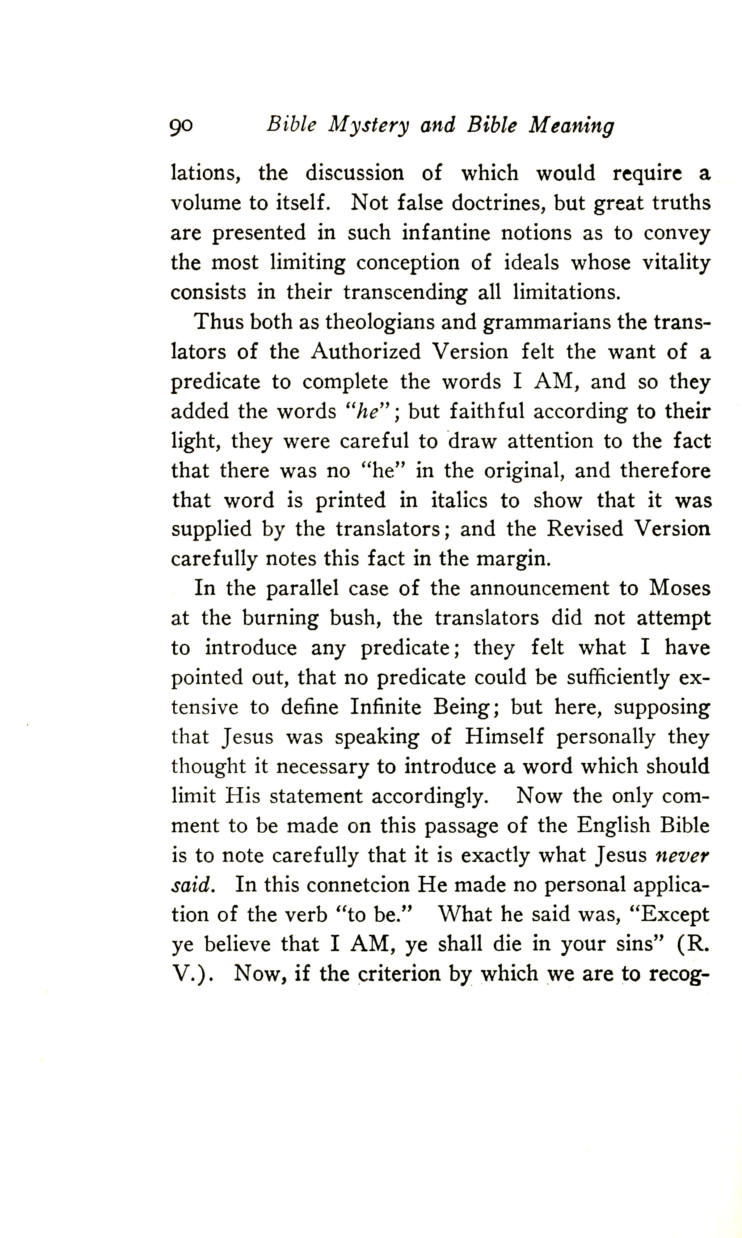 In the parallel case of the announcement to Moses at the burning bush, the translators did not attempt to introduce any predicate; they felt what I have pointed out: that no predicate could be sufficiently extensive to define Infinite Being; but here, supposing that Jesus was speaking of himself personally, they thought it necessary to introduce a word which should limit his statement accordingly. Now the only comment to be made on this passage of the English Bible is to note carefully that it is exactly what Jesus never said. In this connection he made no personal application of the verb "to be". What he said was, "Except ye believe that I AM, ye shall die in your sins" (R.V.). Now, if the criterion by which we are to