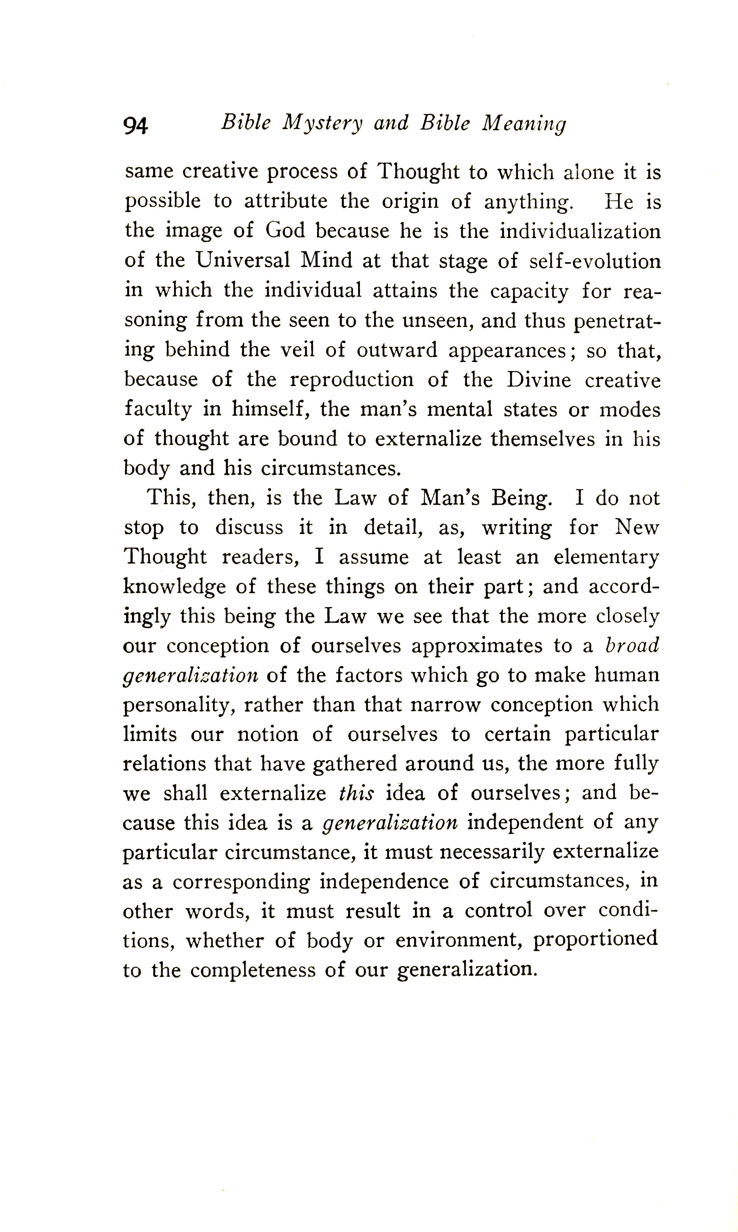 This, then, is the Law of Man's Being. I do not stop to discuss it in detail as, writing for New Thought readers, I assume at least an elementary knowledge of these things on their part; and accordingly, this being the Law, we see that the more closely our conception of ourselves approximates to a broad generalisation of the factors which go to make human personality, rather than that narrow conception which limits our notion of ourselves to certain particular relations that have gathered around us, the more fully we shall externalise this idea of ourselves. And because the idea is a generalisation independent of any particular circumstance, it must necessarily externalise as a corresponding independence of circumstances; in other words, it must result in a control over conditions, whether of body or environment, proportioned to the completeness of our generalisation.