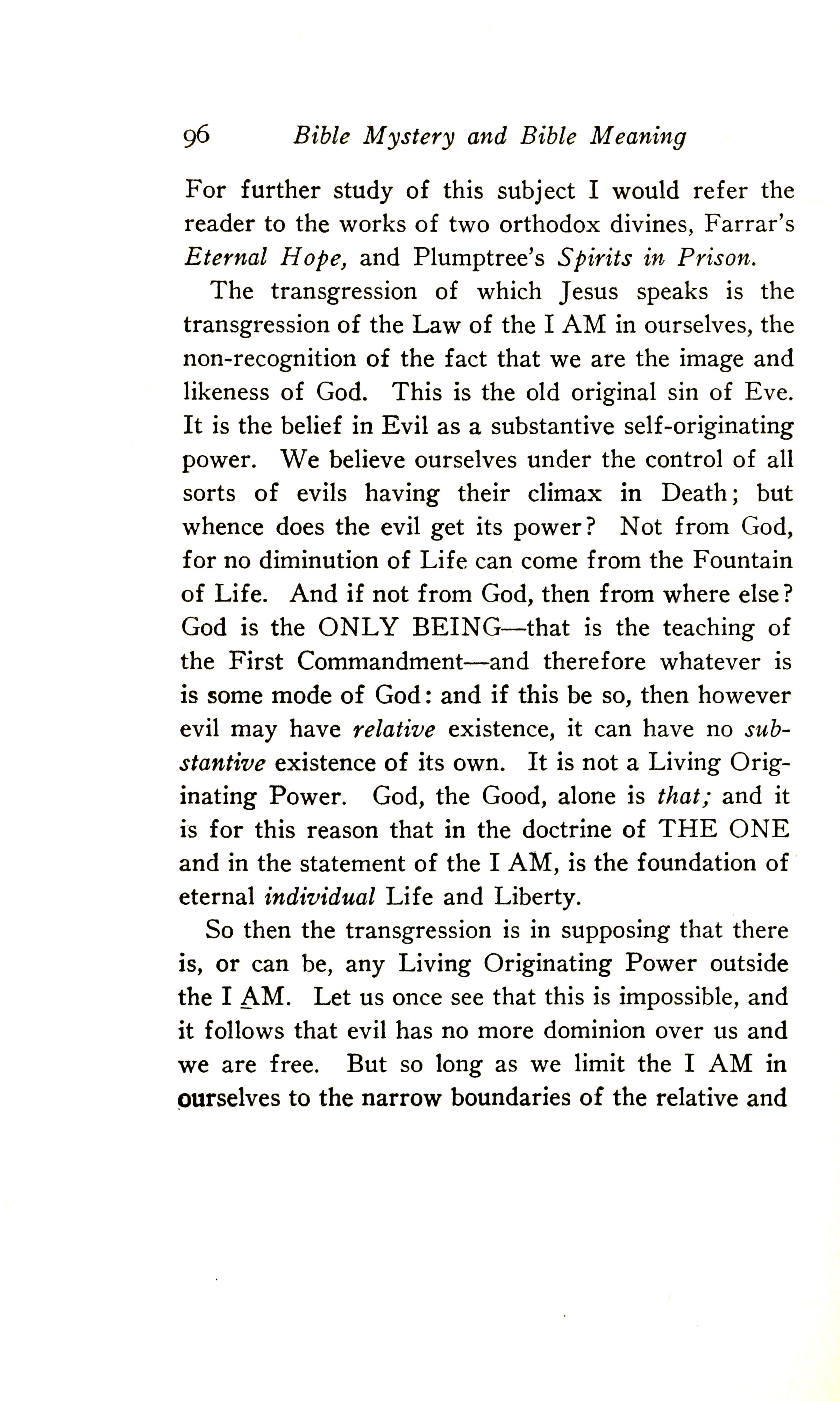 The transgression of which Jesus speaks is the transgression of the Law of the I AM in ourselves, the non-recognition of the fact that we are the image and likeness of God. This is the old original sin of Eve. It is the belief in Evil as a substantive self-originating power. We believe ourselves under the control of all sorts of evils having their climax in Death; but whence does the evil get its power? Not from God, for no diminution of Life can come from the Fountain of Life. And if not from God, then from where else? God is the ONLY BEING --- that is the teaching of the First Commandment --- and therefore whatever is is some mode of God; and if this be so, then however evil may have a relative existence, it can have no substantive existence of its own. It is not a Living Originating Power. God, the Good, alone is that; and it is for this reason that in the doctrine of THE ONE and in the statement of the I AM is the foundation of eternal individual Life and Liberty.