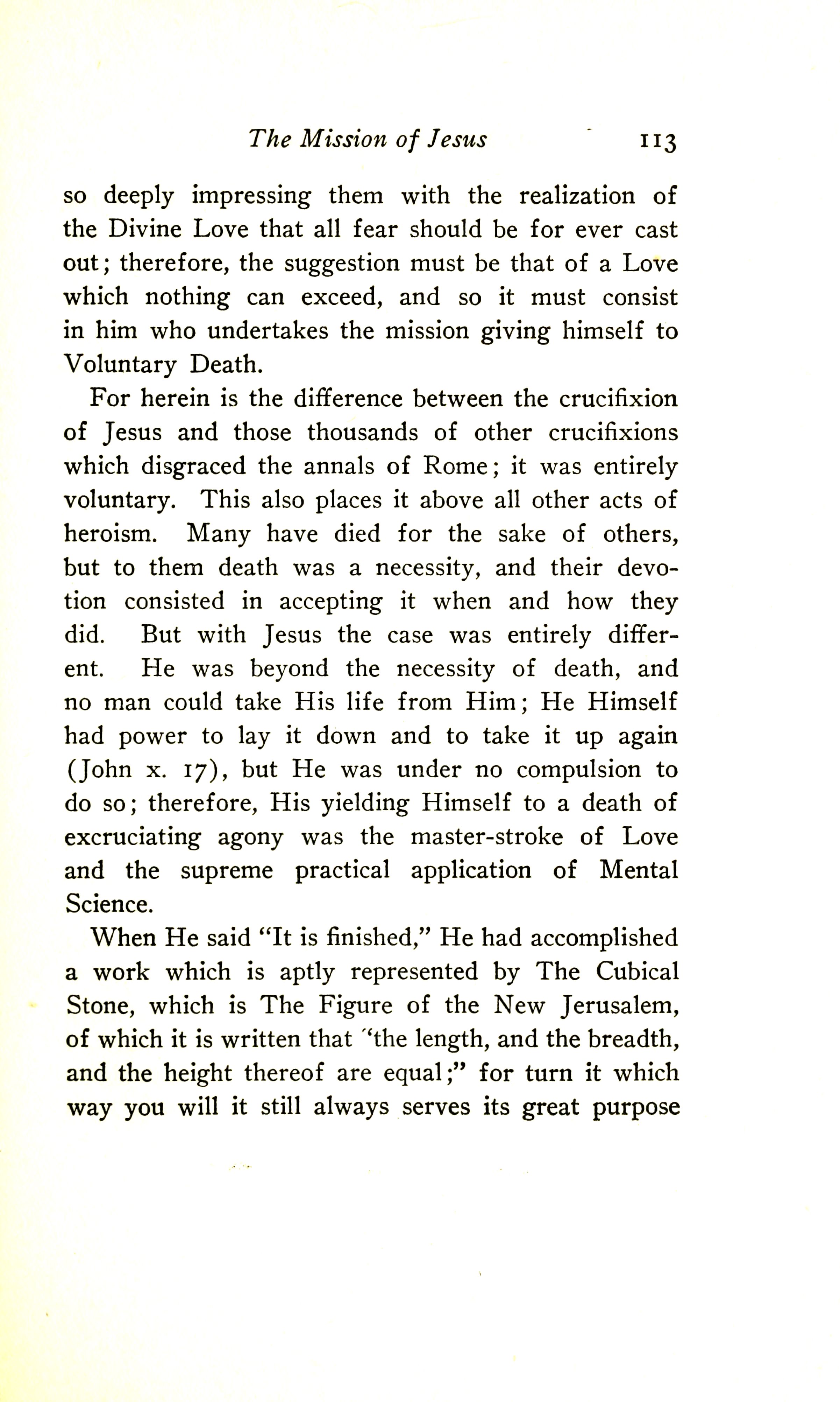 For herein is the difference between the crucifixion of Jesus and those thousands of other crucifixions which disgraced the annals of Rome: it was entirely voluntary. This also places it above all other acts of heroism. Many have died for the sake of others, but to them death was a necessity, and their devotion consisted in accepting it when and how they did. But with Jesus the case was entirely different. He was beyond the necessity of death, and no man could take his life from him. He himself had power to lay it down and to take it up again (John 10:17), but he was under no compulsion to do so; therefore his yielding himself to a death of excruciating agony was the master-stroke of Love and the supreme practical application of Mental Science.