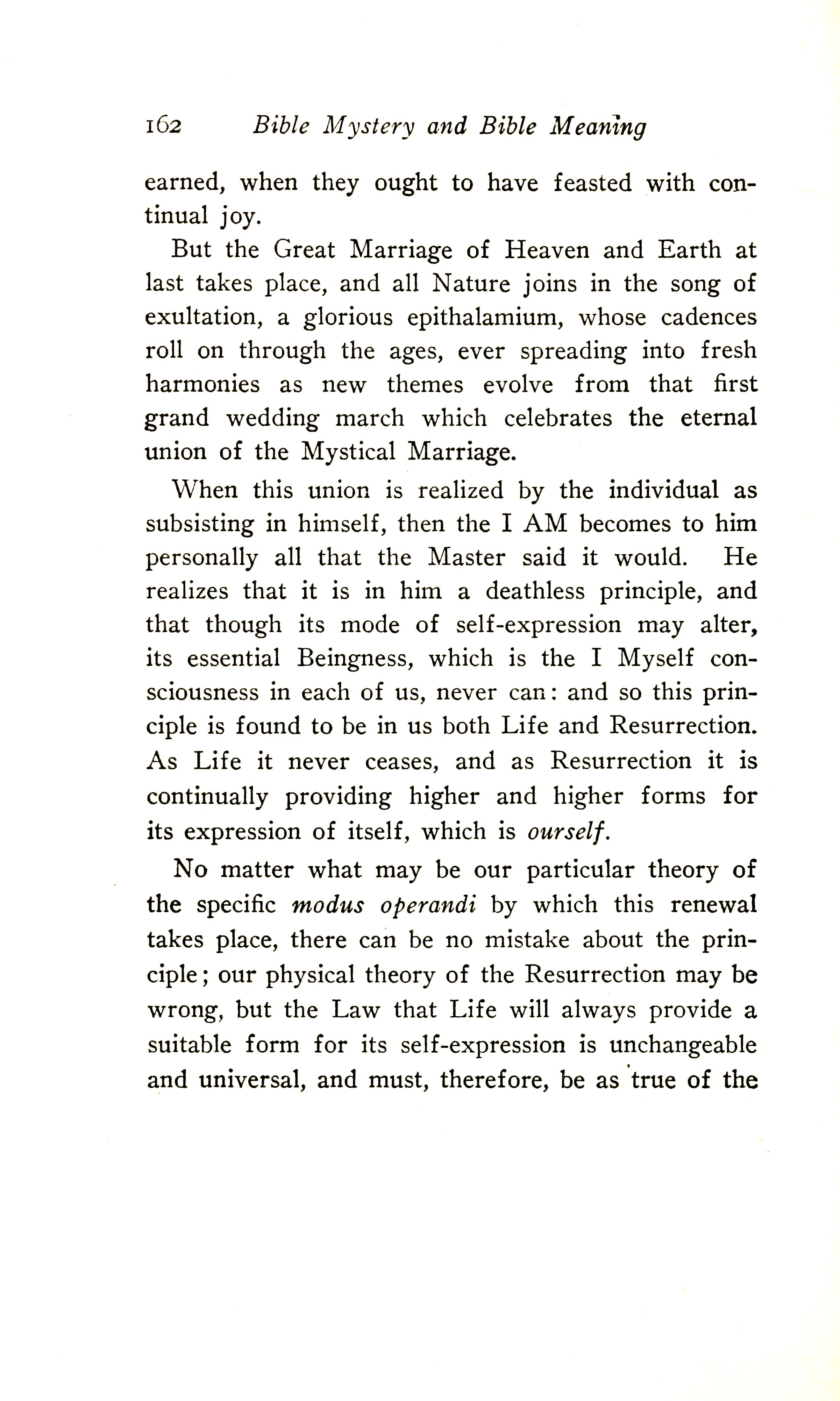 When this union is realised by the individual as subsisting in himself, then the I AM becomes to him personally all that the Master said it would. He realises that it is in him a deathless principle and that though its mode of self-expression may alter, its essential Beingness, which is the I Myself consciousness in each of us, never can; and so this principle is found to be in us both Life and Resurrection. As Life, it never ceases; and as Resurrection, it is continually providing higher and higher forms for its expression of Itself, which is ourself.
